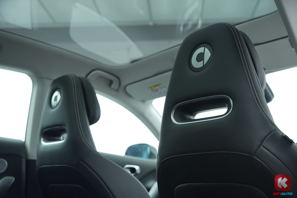 轿跑座椅由大面积真皮包覆,加入撞色缝线,头枕上嵌入 smart Logo,并使用行业首创的座椅铆钉设计,提升座舱氛围。