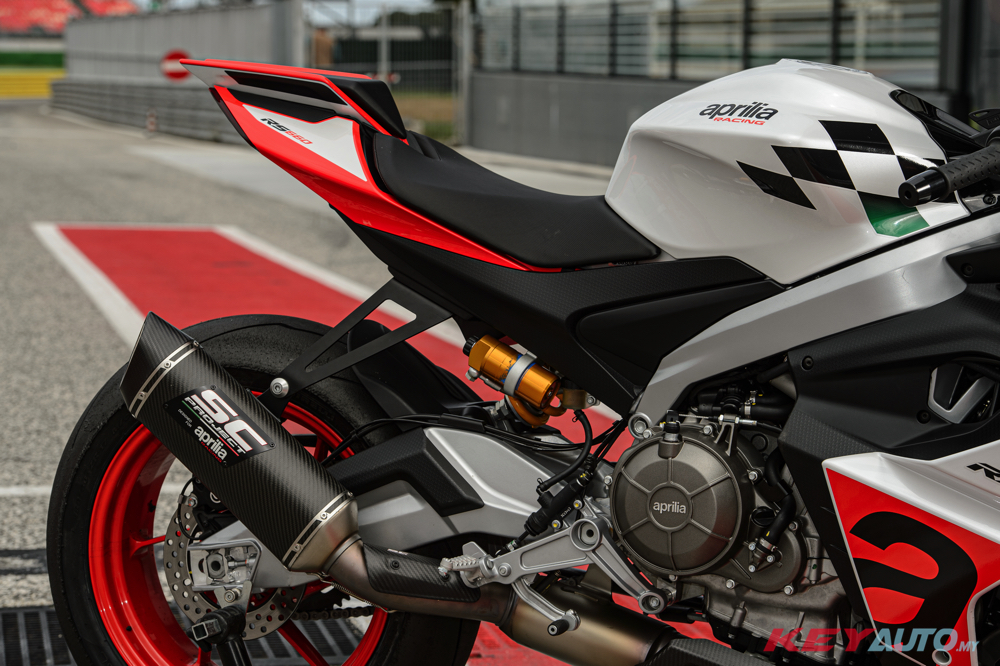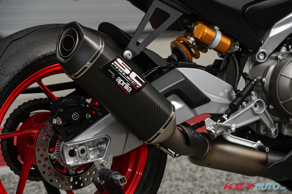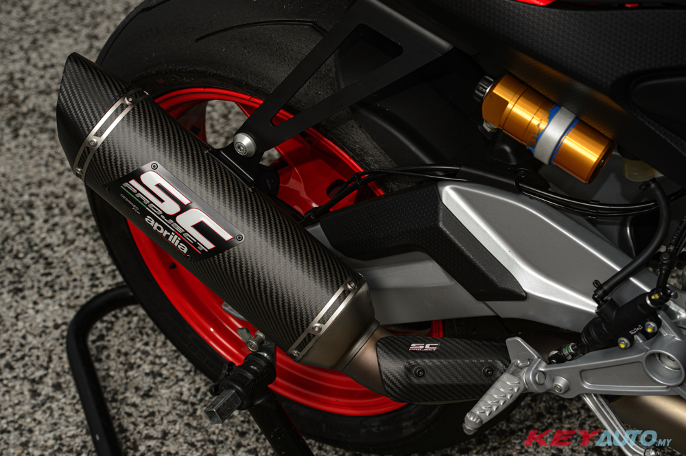 Aprilia RS660 Extrema 首先是升级了定制的 SC Project 排气管,采用轻量化碳纤维桶身,配有碳消音器,并取消了原厂的底排设计,可在保持街道合法性的同时减轻重量。