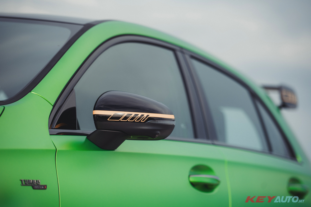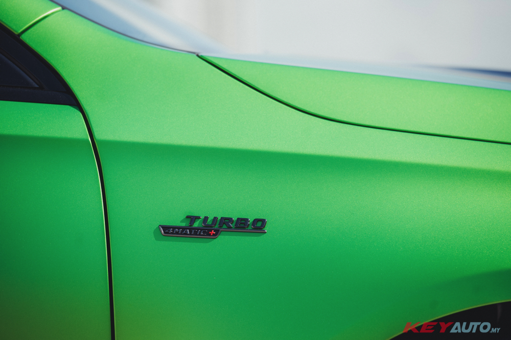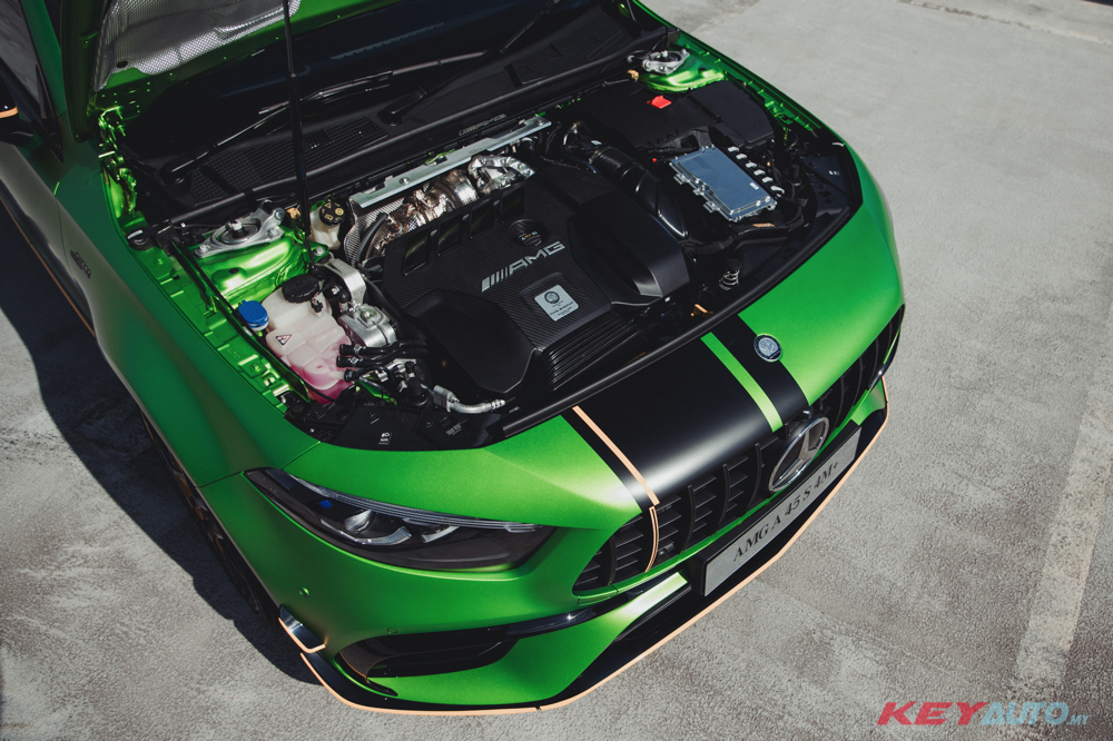 限量版的 AMG A 45 S 4Matic+ 的车身颜色采用了辨识度极高的“ AMG green hell magno ”绿色涂装,配上黑色和黄色的车身贴纸,整体搭配相当亮眼。引擎盖添加了 AMG 徽章,而车门的部分则黏上“ 45 S ”字样。哑光黑 19 寸 AMG 轮圈采用七辐式设计,加上黄色作为配色,凸显了轮圈设计,里头的煞车卡钳也改为黑色配搭白色 AMG 标志。