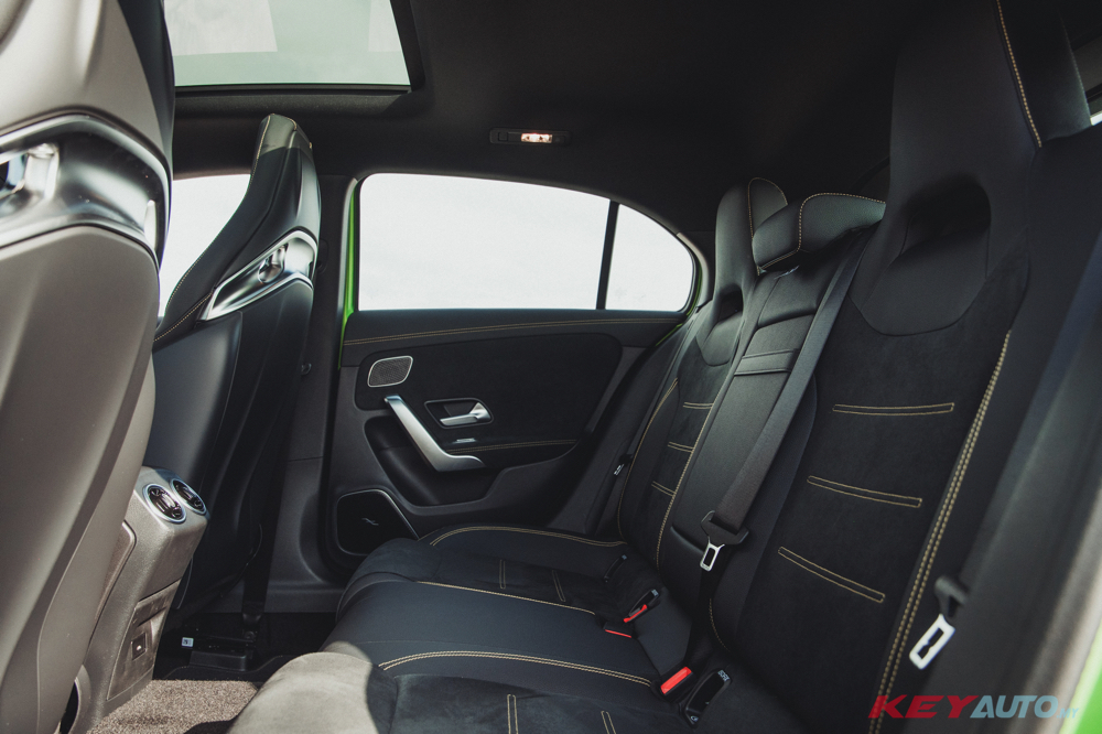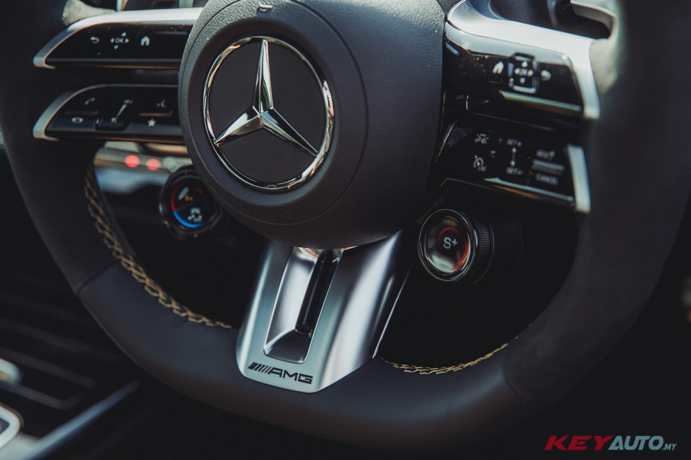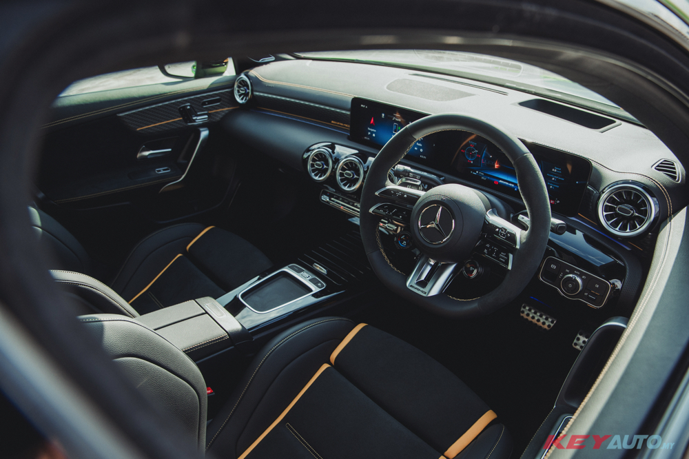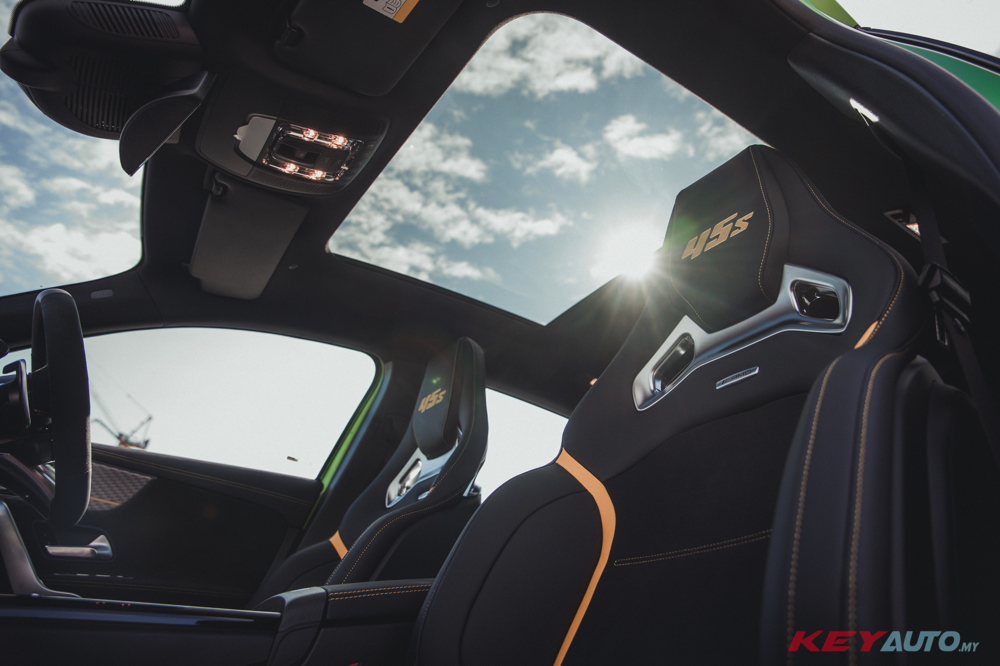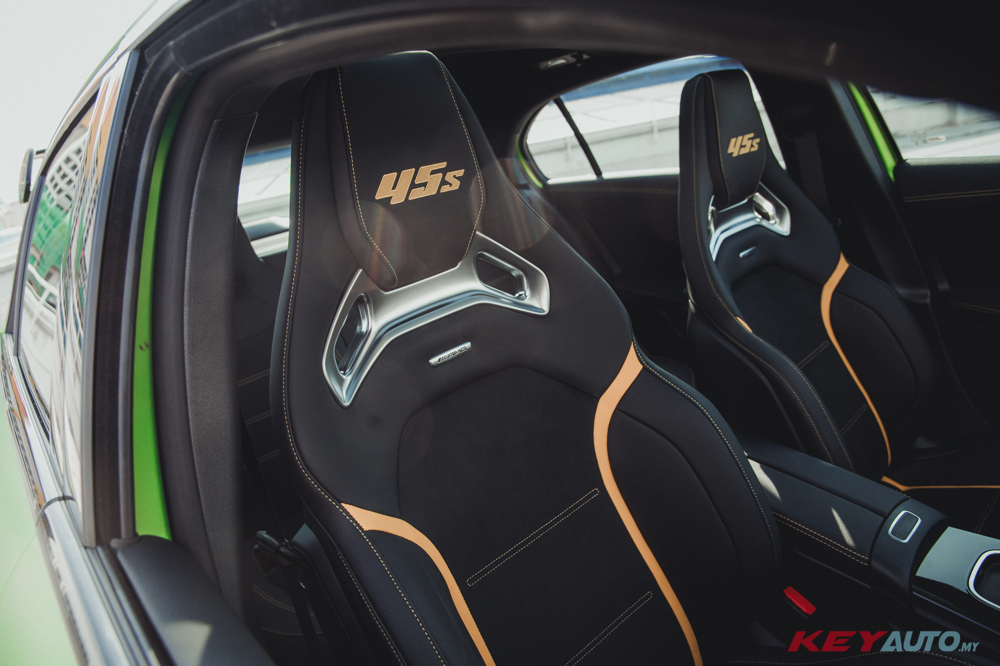 内装的部分,车子搭载 AMG 黑色运动化座椅(结合 ARTICO 人造皮革和 MICROCUT 超细纤维),车内装饰采用黄色缝线,而前排座椅头枕上也刺有“ 45 S ”标志。