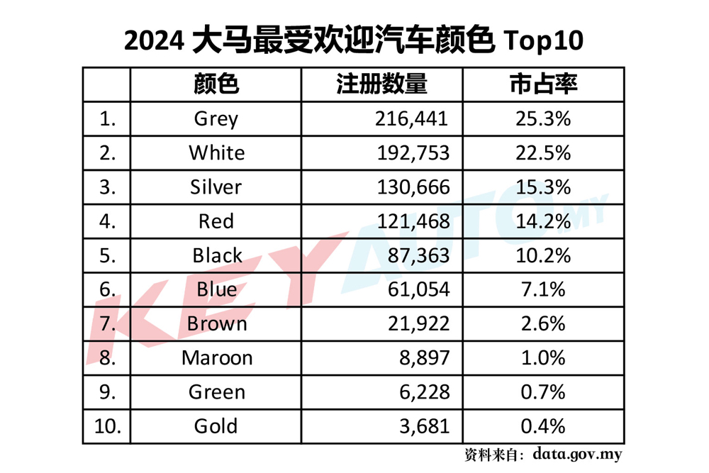2024 大马最受欢迎车色 Top10:第一名灰色,市占率 25.3%!