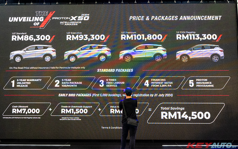 The 2024 Proton X50 is now available for sale, comes with a 5-year unlimited mileage factory warranty, 5-year data package (1GB per month), 6 free labor service, low loan interest rate of 2.28% and Proton insurance package.
