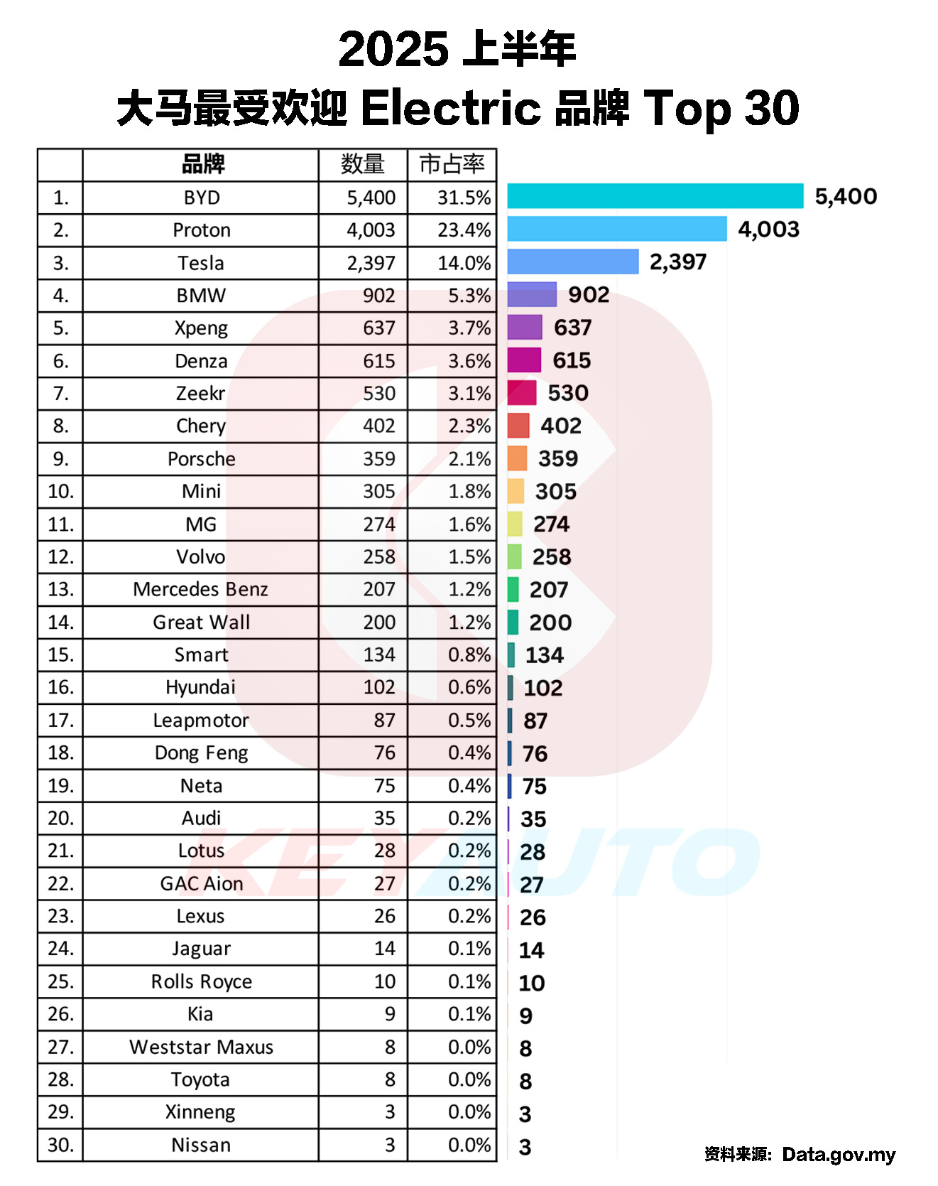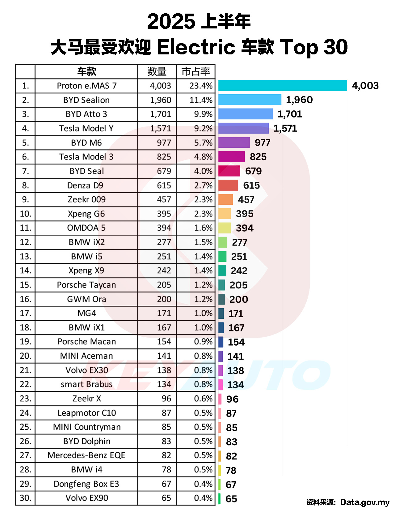 整体可见,2025 上半年的电动车总销量为 17,143 辆,占大马汽车市场的 4.3%,相比 2024 上半年(10,663 辆)有明显增长。
