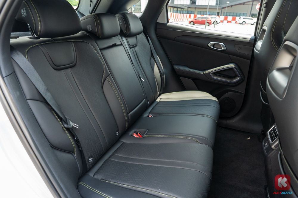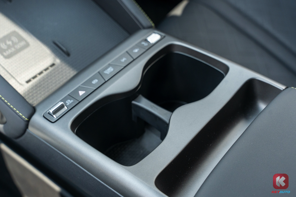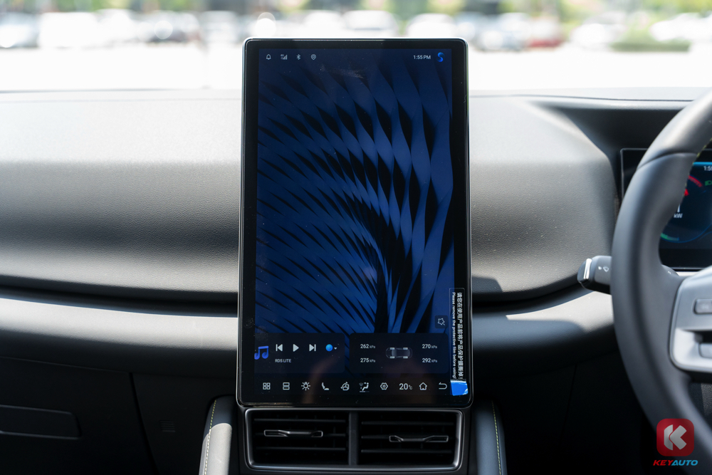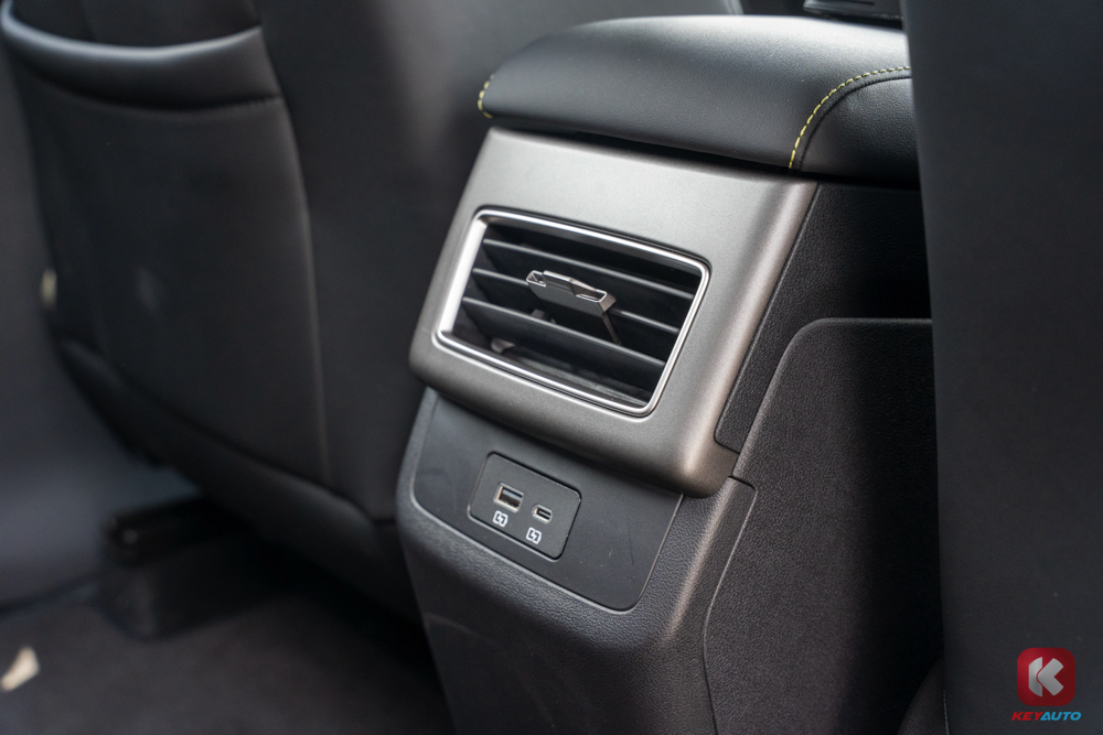 车内一律采用黑色内饰,搭载 12.8 寸可旋转中控荧幕(支持无线 Apple CarPlay 和 Android Auto),手机无线充电面板、合成皮革座椅、前排座椅通风功能等。后座可以 60:40 折叠,放下后座的车厢容量为 1,320L。