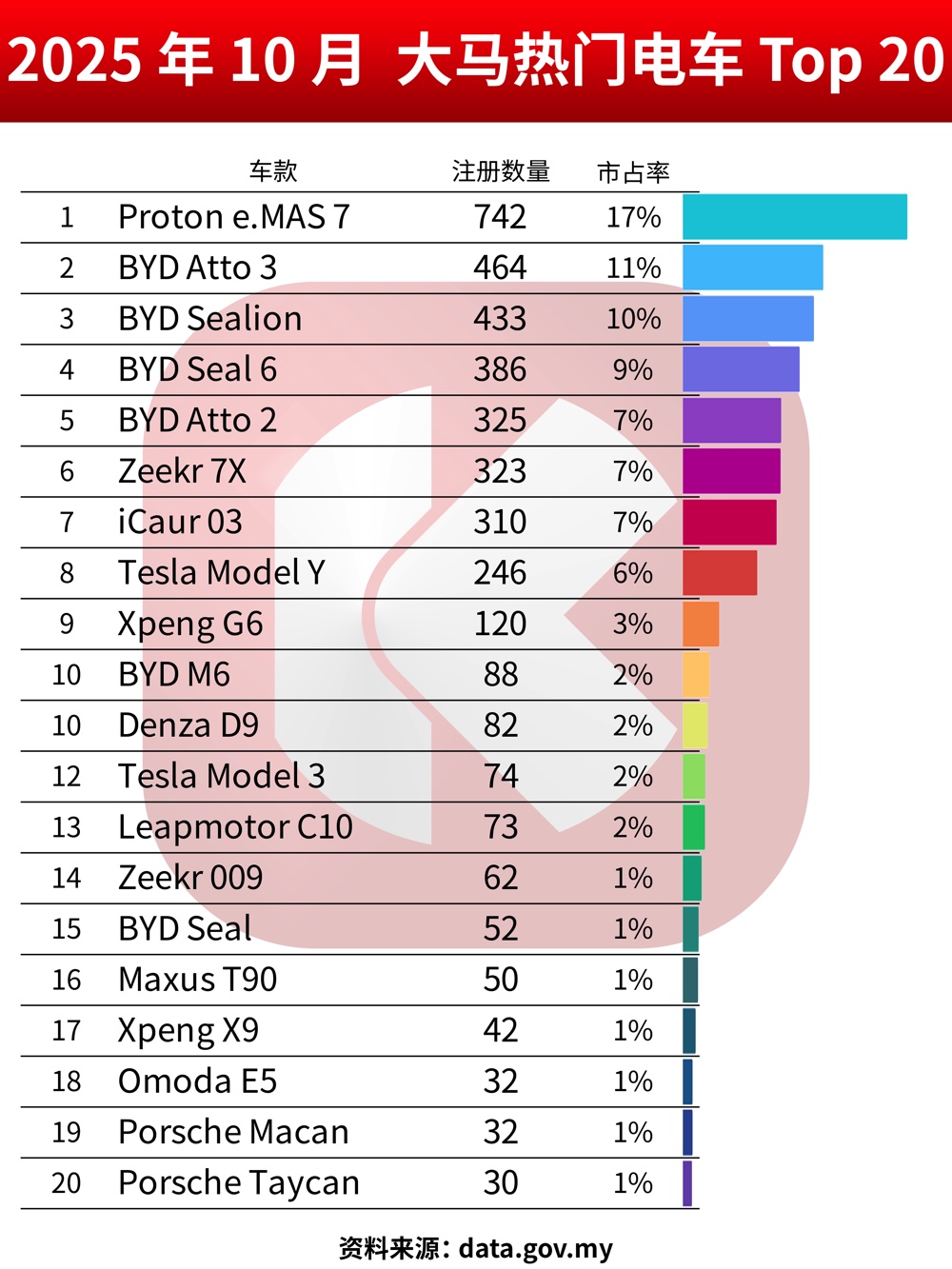 10月份大马 JPJ 新车注册数据终于出炉,除了汽车销量排行榜 Top 10,KeyAuto.my 也整理出当月热销电动车排行榜 Top 20。