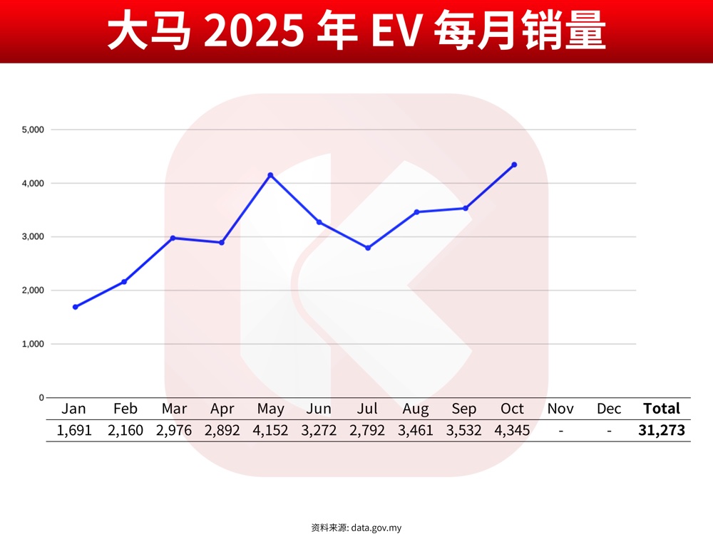 在大马政府与各大汽车品牌致力推广下,7 月之后的新车销量皆有攀升,10 月的电动车销量更是今年的单月销量新高,为 4,345 辆。从年初至今,终于在 10 月份时突破了 3 万辆大关,电动车注册量达 31,273 辆。