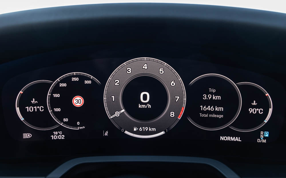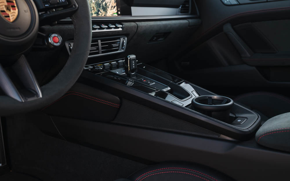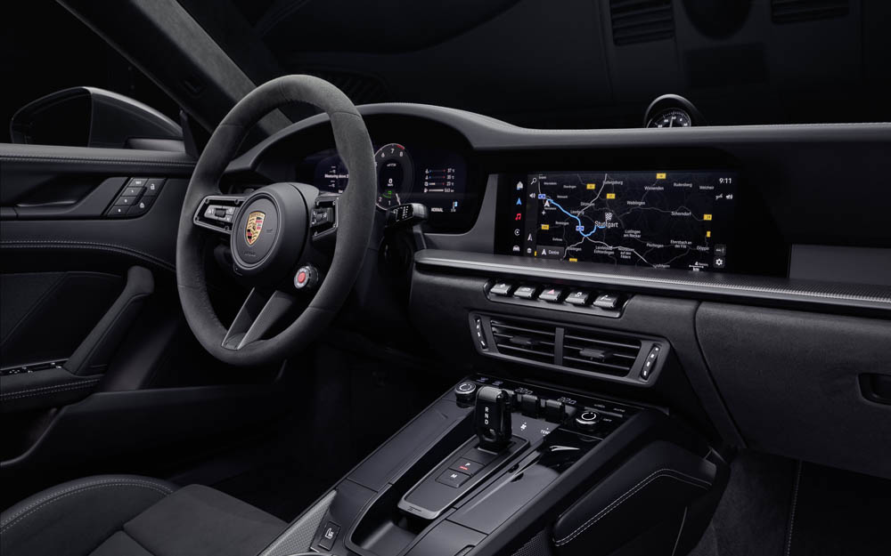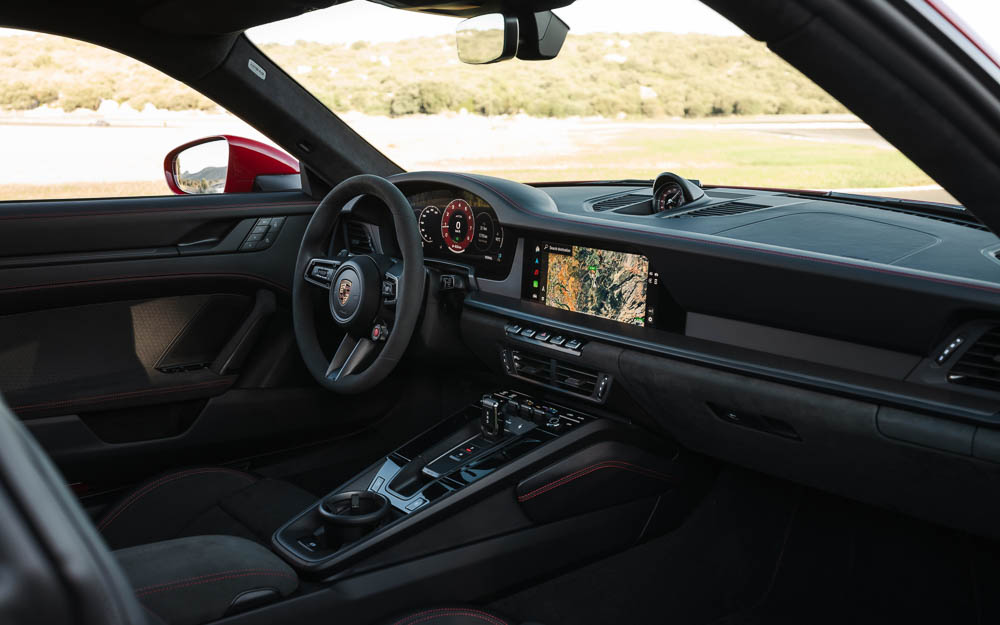 Inside, the 911 offers a driver-centric experience with Porsche’s updated Driver Experience cockpit. A 12.6-inch fully digital curved instrument cluster now replaces the traditional analog dials, customizable to display up to seven different layouts—including a heritage-inspired Classic view.