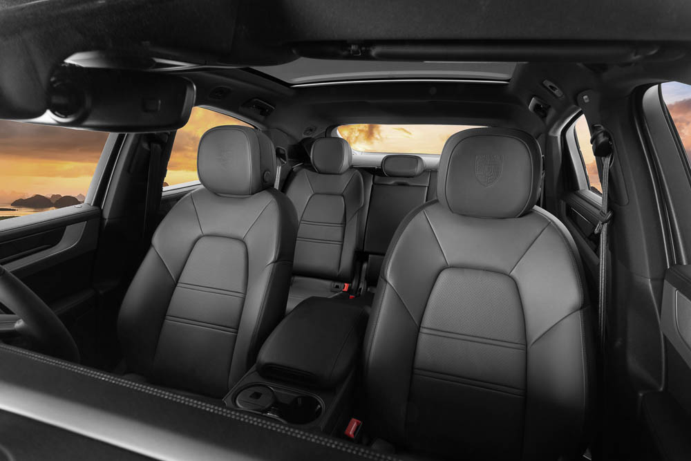 The luxury SUV offers leather upholstery options in Black or Bordeaux Red, complemented by Porsche crests on the front headrests. Adjustable 14-way comfort seats with a memory package ensure maximum driver and passenger comfort.