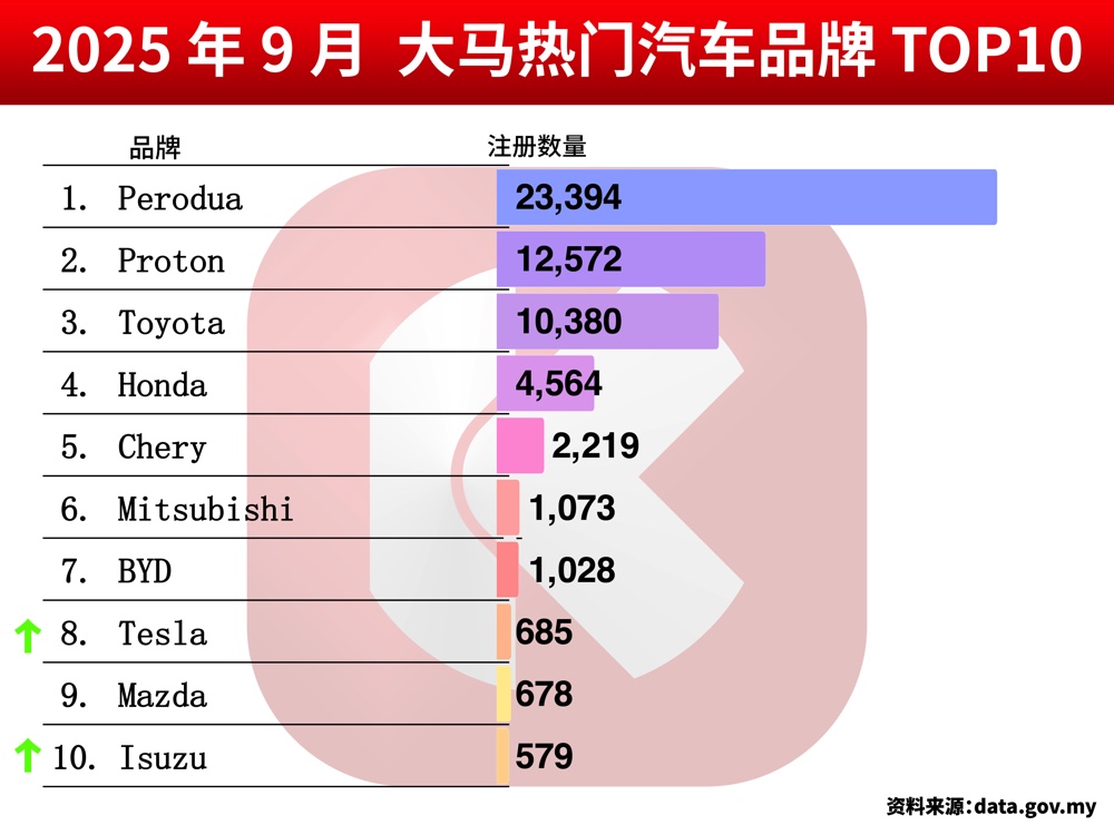 9 月份的大马汽车销量前 10 排行榜终于有了变化,两大德系品牌 BMW 和 Mercedes-Benz 都被挤下榜,而成功跃身 10 强的是 Tesla 和 Isuzu,分别注册了 685 辆和 579 辆新车。