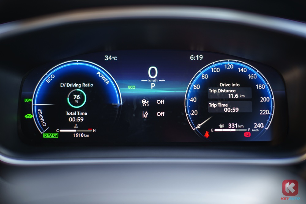 车子配有多种驾驶模式,除了常见的 Normal、Eco 和 Power,也配备了 EV 和 B 模式。在市区中堵车,龟速行驶时采用 EV 模式,引擎在这个时候将会完全“休息”;而在需要不断踩刹车的路况,譬如山路或在湿滑路面时,开启 B 模式可帮助增加煞车效果,并加大能量回收,减慢车速的同时还可避免煞车盘连续使用而过热的情况。在对应各种路况的不同驾驶模式下,油耗最高效益为 23.3km/L,达到真正的省油。