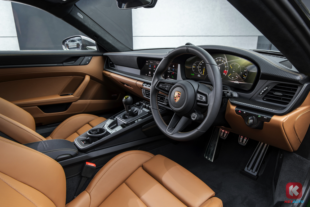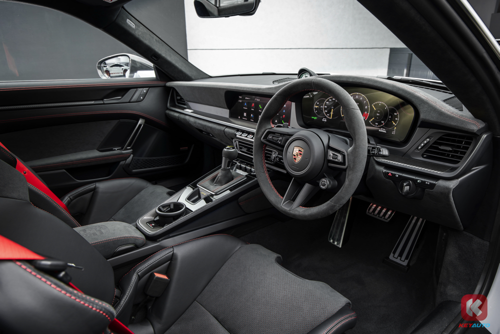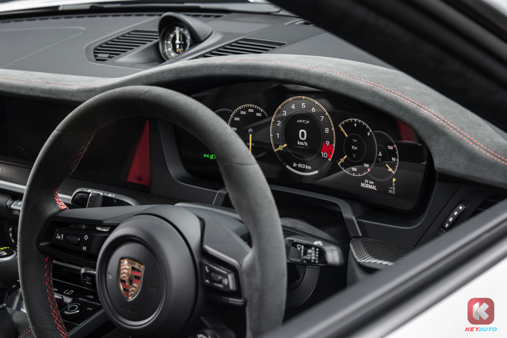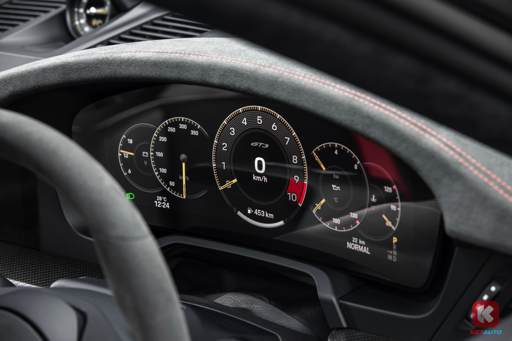 新款 GT3 全系改为 12.6 吋弯曲数字仪表盘,可切换为经典赛车式布局(9,000rpm 转速表居中),或简化为 “Track Screen” 显示(仅保留胎压/温度、油压、油温、水温、油量等信息)。