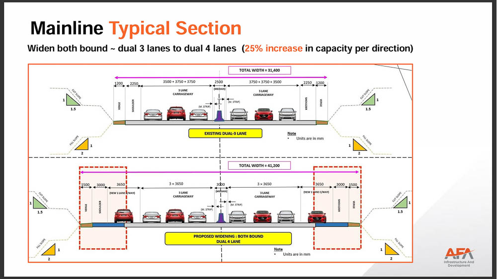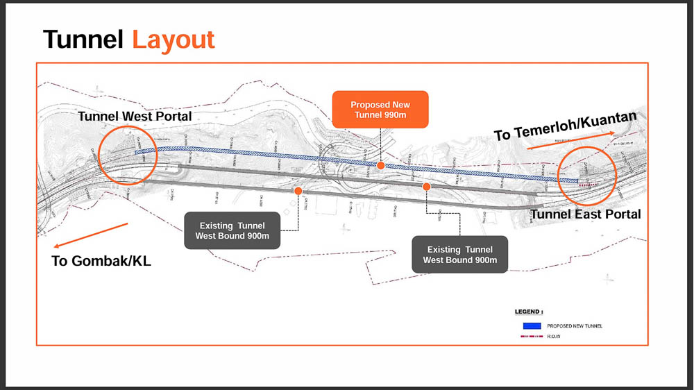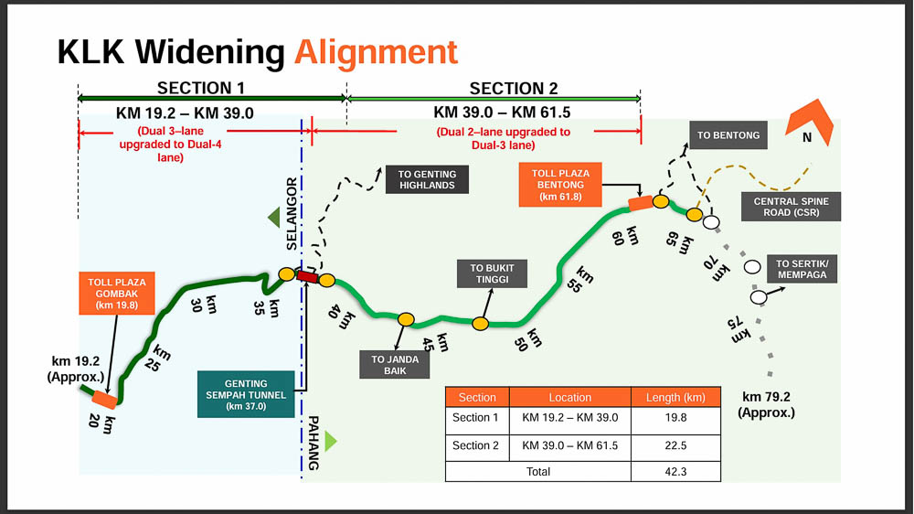 Expand from dual three-lanes to dual four-lanes, including a new two-lane tunnel from Gombak Toll Plaza to Genting Sempah.