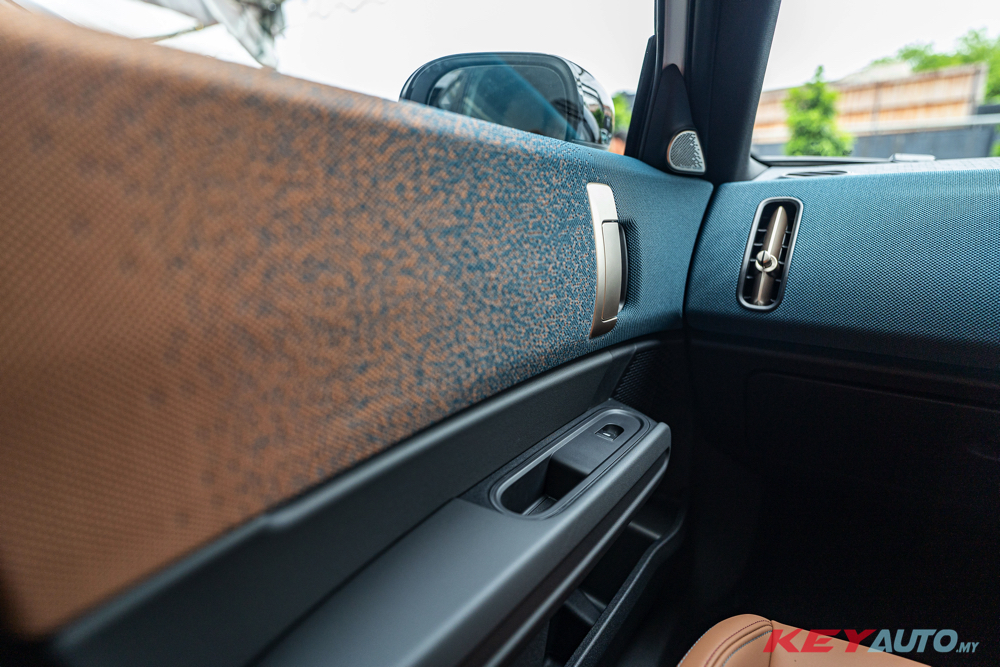 纯电版 Countryman SE ALL4 采用了 Favoured Trim,包含 Dark Petrol 色碎格子花样的编织面料、色彩鲜明的饰条、运动化车座和方向盘。