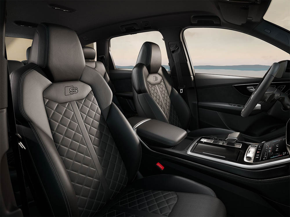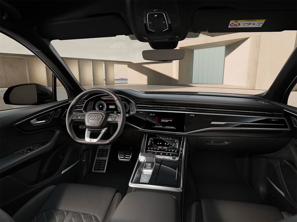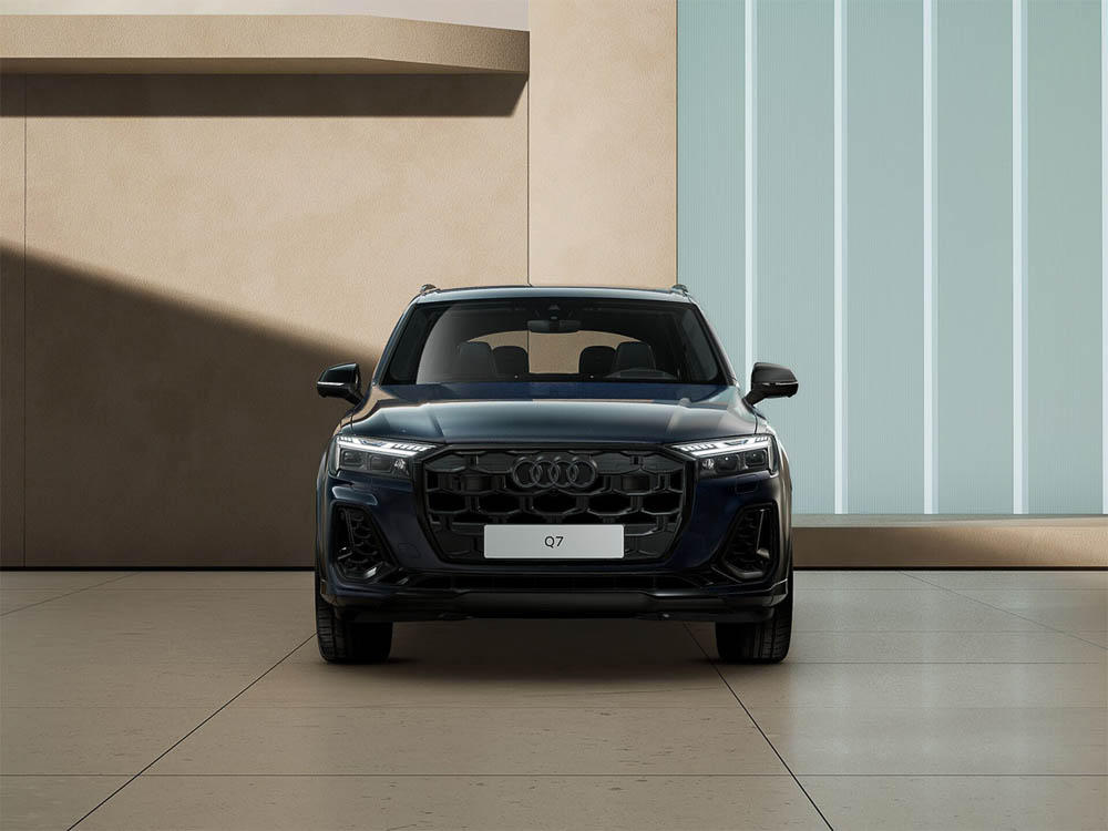 The latest Q7 makes an unmistakable visual statement with its bold lines and aggressive stance, complemented by the standard S line trim and Black Styling Package Plus. These design elements include a distinctive black Audi Singleframe grille, anthracite grey Audi rings, and a Q7 model badge that amplifies the SUV’s commanding presence. Completing the look are 22-inch Audi Sports 5-V-spoke star wheels and a roof edge spoiler—features that not only add visual flair but also improve aerodynamics.