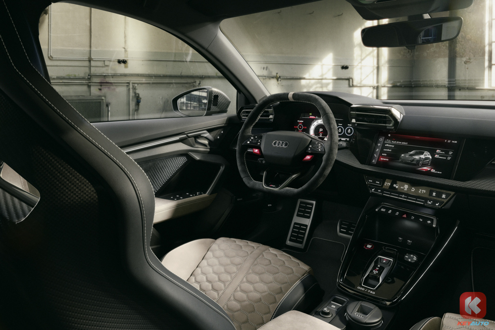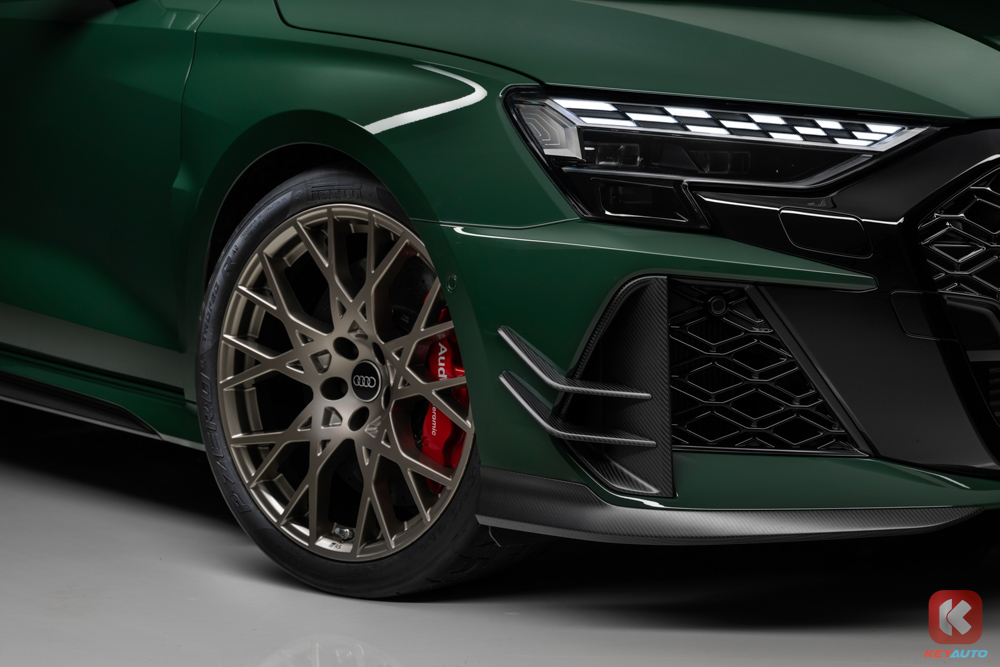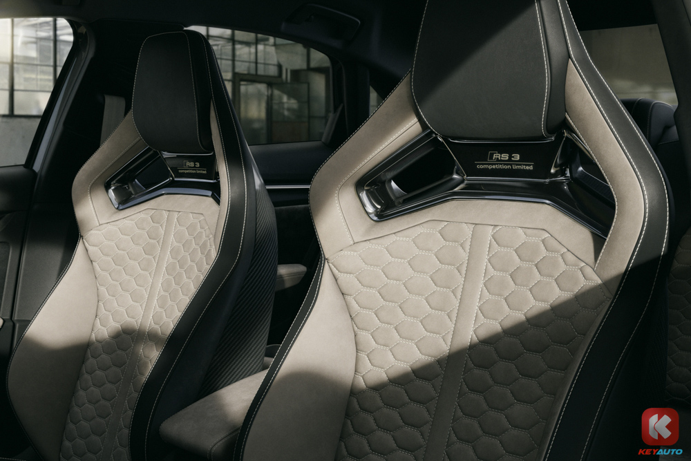 在外观上,Audi 为 RS 3 Competition Limited 加上了亚光碳纤维材质的前定风翼、后视镜盖、侧裙、后扰流板及扩散器饰条。并标配 19 寸钕金 (Neodymium Gold) 亚光十幅轮毂。