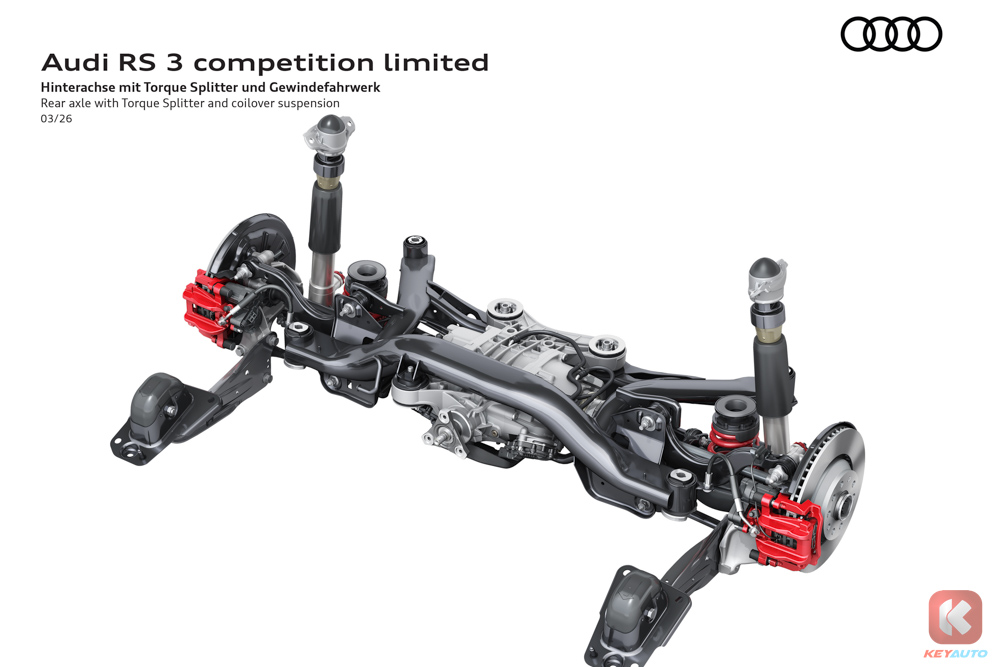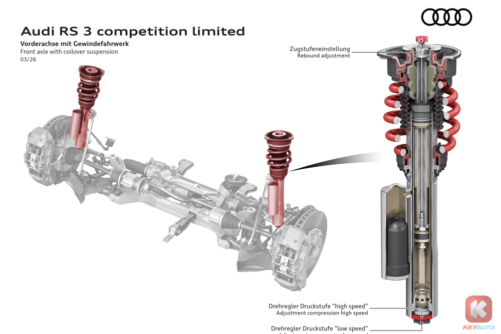 Audi RS 3 Competition Limited 此次的升级点还包括地盘层面,原厂直接转配 3-Way 可调的绞牙避震,支持独立调节高/低速压缩阻尼,分别有 15 级、 12 级以及 16 级回弹阻尼可调。