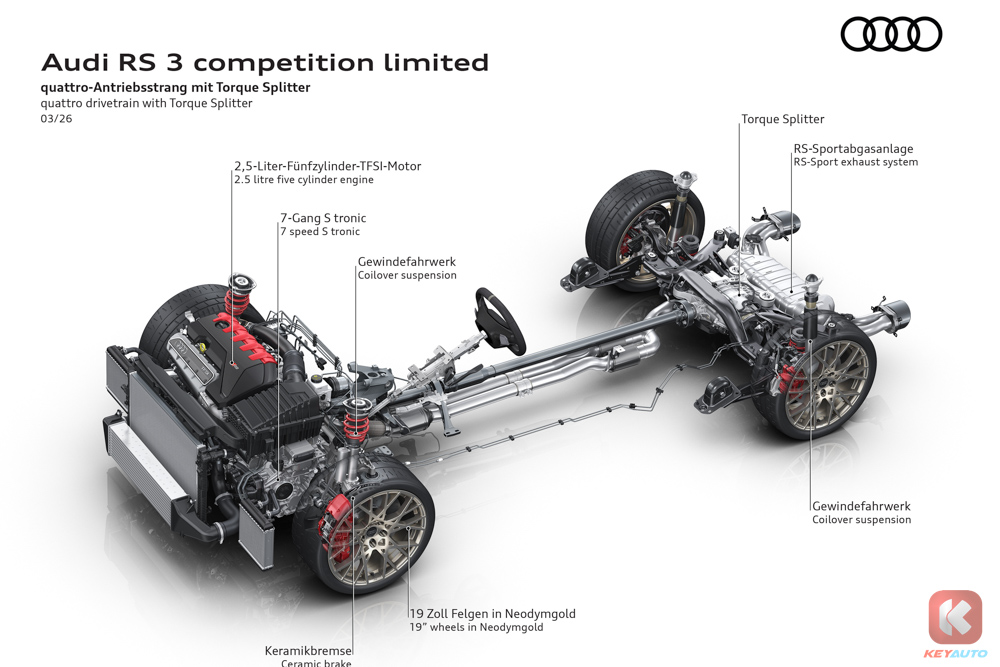 成就 Audi 车企的莫过于出现在 70 年代的直列 5 缸引擎,经过迭代进化,如今这具 2.5L 直列五缸涡轮引擎可输出 400PS / 500Nm 峰值动力,匹配 7-S Tronic 双离合变速箱和 Audi 引以为傲的 QUATTRO 全时四驱系统(含 RS 扭矩分配)。此限量版还搭载了带 Valve Tronic 阀门控制的 RS 运动排气,0-100 km/h 仅需 3.8 秒 ,极速可达 290 km/h!