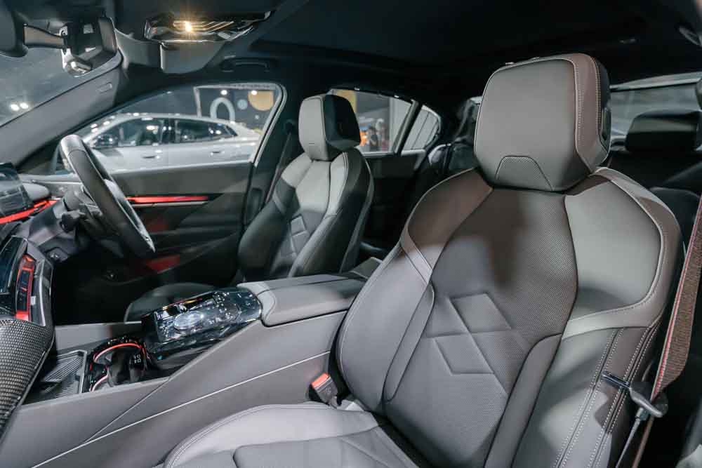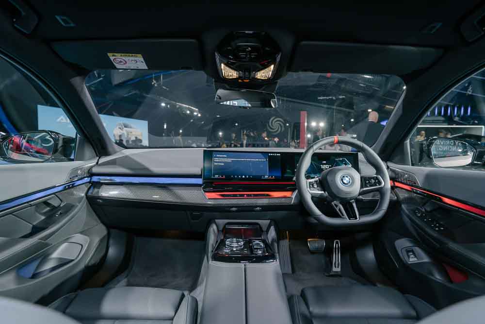 Inside the cabin, the BMW i5 M60 xDrive offers the luxurious BMW Curved Display, which includes a 12.3-inch instrument panel and a 14.9-inch touchscreen Control Display for seamless interaction. The Bowers & Wilkins Surround Sound System, with 18 speakers and 655 Watts, delivers an exceptional audio experience.