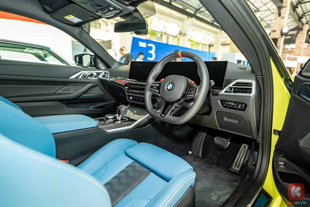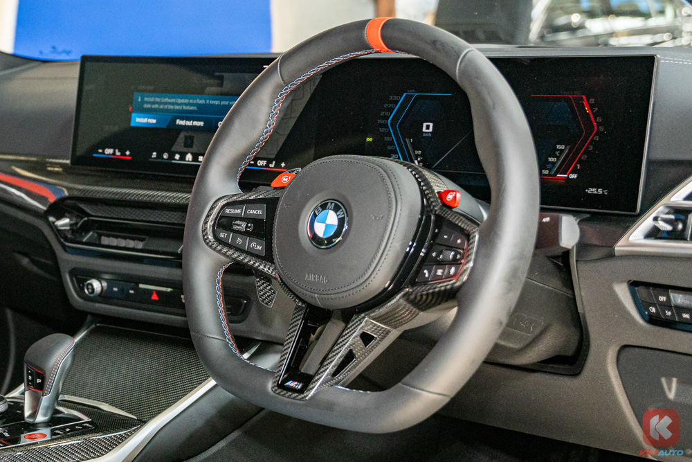 内装方面,前后座椅均是真皮包裹, M 方向盘配有 M1/M2 快捷键,家族式大曲面屏幕(12.3 寸的仪表盘和 14.9 寸的中控),BMW OS 8.5 操作系统,Apple CarPlay/ Android Auto,高功率 Harman/Kardon 音响和 M 桶椅,碳纤维饰板等等提升及提供情绪价值和日常使用体验的配备。