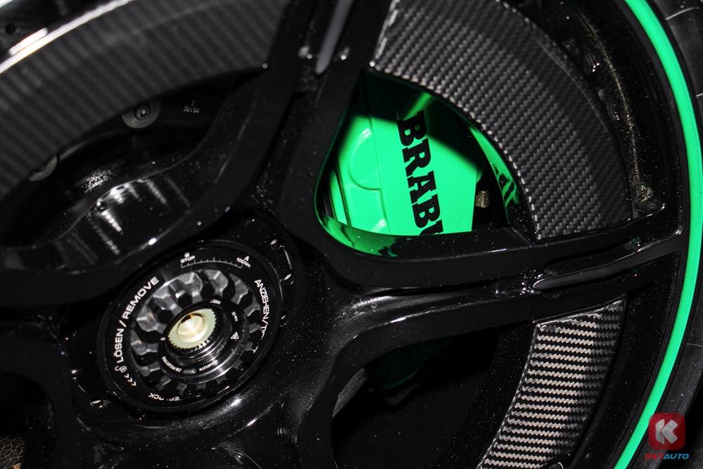 车尾则是 Widestar 饰板,配有能产生更大后轴下压力的碳纤维扩散器,并展示了 Inconel 高性能排气系统的四个排气管。车子采用 22/21 寸 Brabus Monoblock P 五幅式设计轮圈,起材质和结构可有效地利用制动时加热的空气排出轮井。