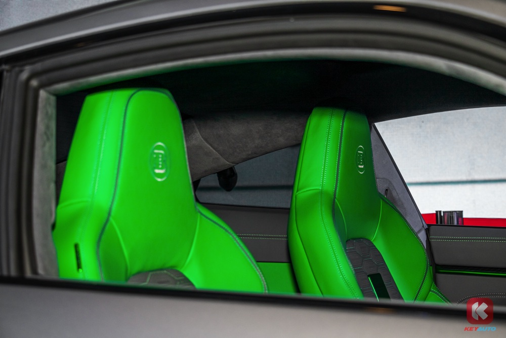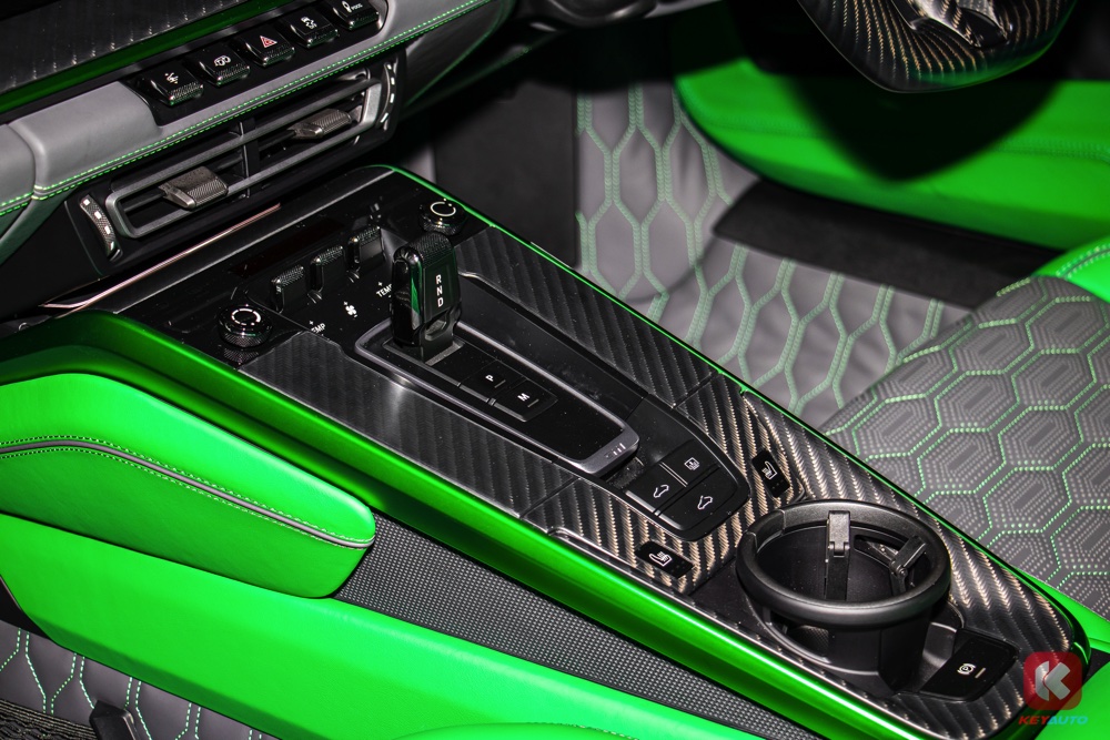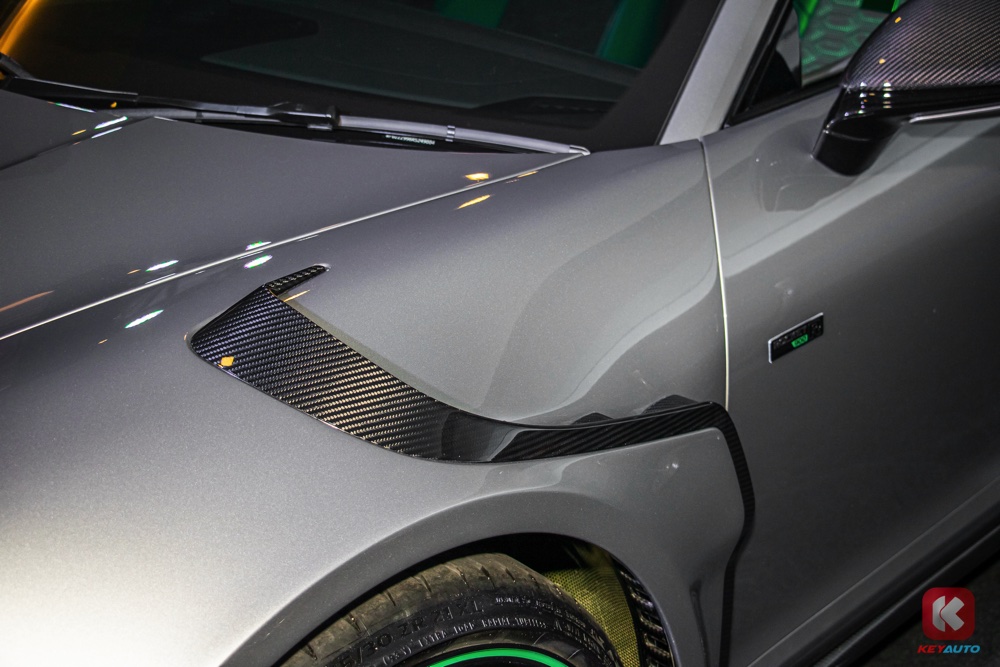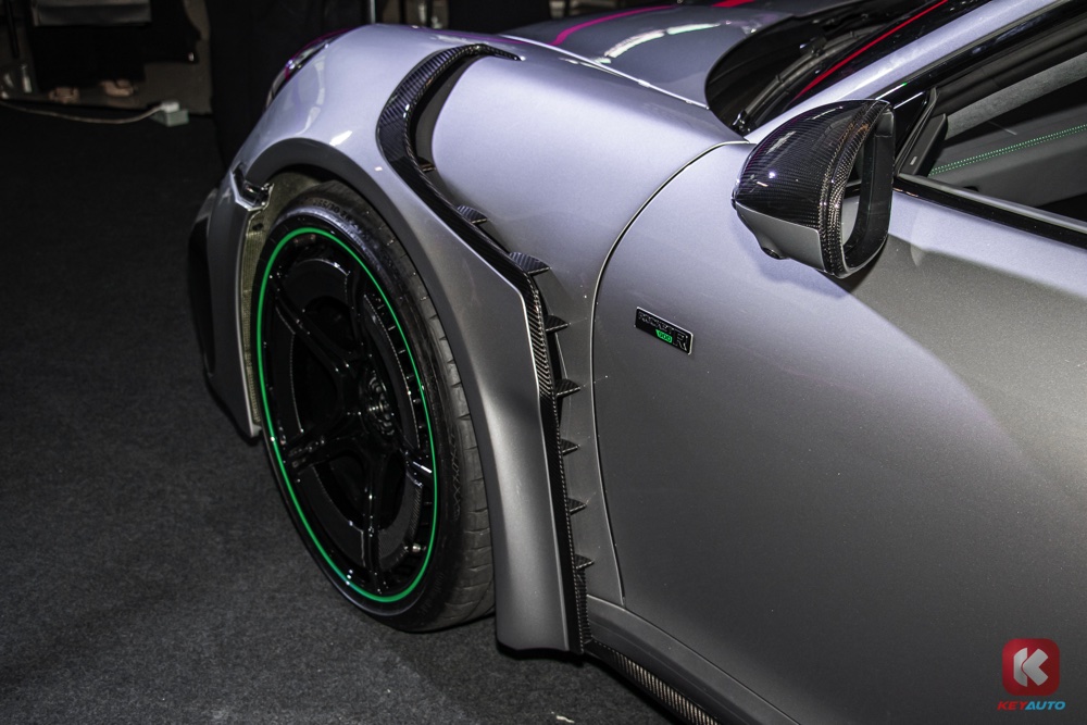 Brabus 900 Rocket R 配以量身定制的 Widestar 碳纤车身配件,提高空气动力学效率。前脸有 Brabus 唇形扰流板,可在高速行驶时产生最佳的下压力,并将其流引进散热器和前制动器的进气口。196.8cm 的碳纤维摇臂板(标准版为 190cm)使超级跑车的楔形车身更加醒目,其大型进气口为发动机提供燃烧和冷却空气。
