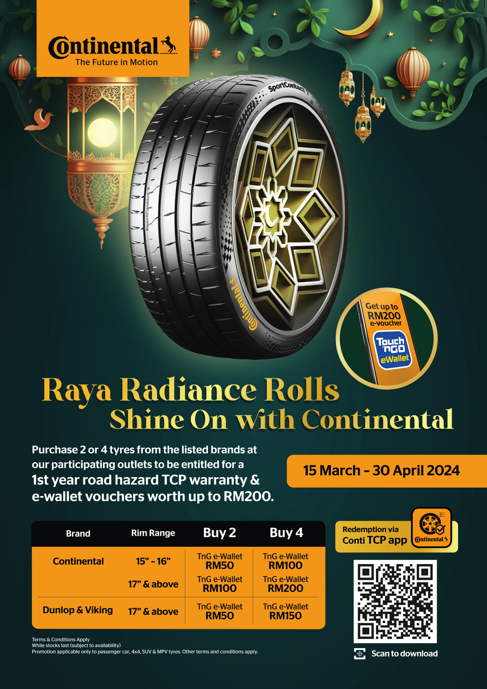 从 3 月 15 日至 4 月 30 日,客户在全国任何参与车厂或在 Continental 官方网店购买至少 2 条 15 寸及以上的 Continenta 轮胎,或至少 2 条 17 寸以上的 Dunlop 或 Viking 轮胎,限于私家车、SUV、MPV 以及四轮驱动车的轮胎,即可兑换高达 RM200 的 TnG 电子钱包。