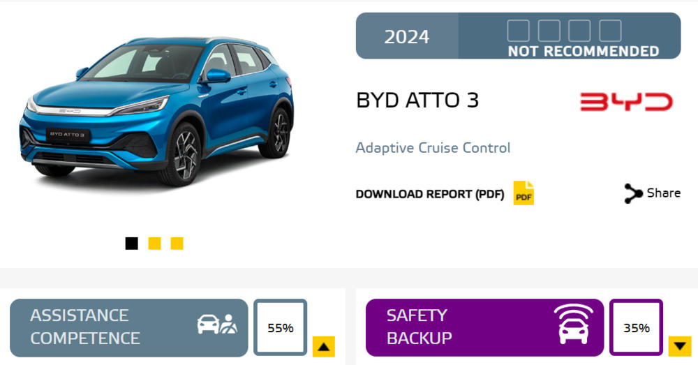至于早前在 2022 年 Euro NCAP 碰撞测试上获得五星安全评级的 BYD Atto 3 则在这次的驾驶辅助系统评测中被评为 “不推荐”。Euro NCAP 指 BYD Atto 3 的自适应巡航表现欠佳,在遇到障碍物时无法有效煞车,并且在长时间没有操作后,关闭转向支持,但依旧保持速度控制,令驾驶员无法即时做出反应。