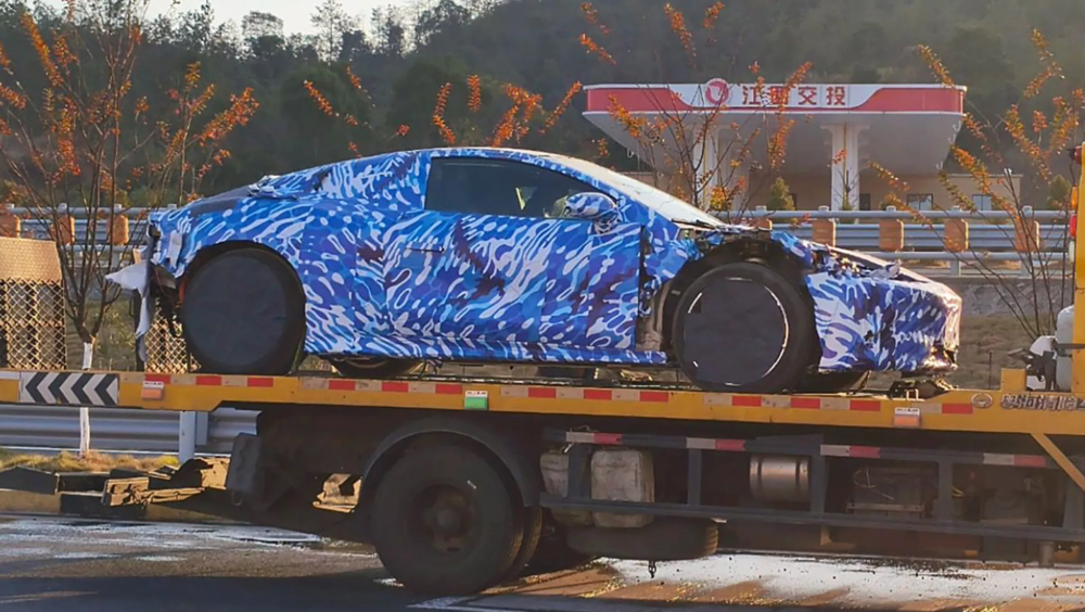 照片上可见拖车载着一辆布满蓝色迷彩的双门跑车,车子配有大尺寸轮圈、性能轮胎、双门设计,配上紧凑流畅的车身线条以及低矮车体的设计,整体相当运动化。车子的外观并不完整,没有头灯和后保险杆,但依旧能从头灯新装看出腾势的家族设计语言。