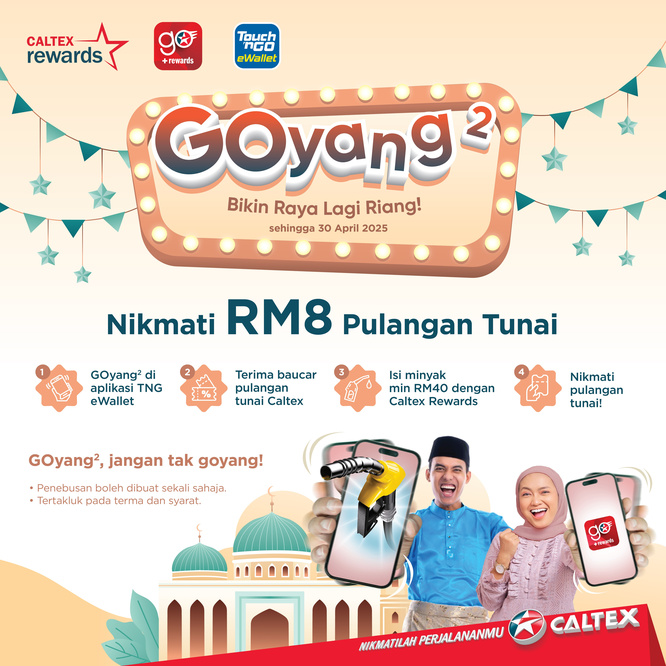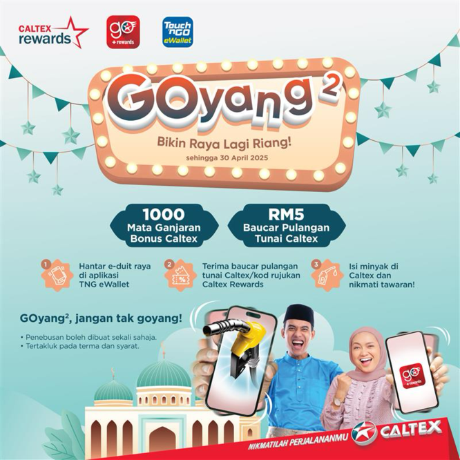 同时,车主可透过 TNG eWallet 应用程式参与 “GOyang2” 活动,摇动手机即有机会获得 RM8 Caltex 现金回扣券,只需在 Caltex Rewards 消费满 RM40 即可兑现。同时,透过 TNG eWallet 发送开斋节电子青包(e-Raya packet)者,可获得RM5 Caltex 现金回扣券、1,000 Caltex 奖励积分(需使用推荐码)或 RM5 CaltexGO 燃油礼券。