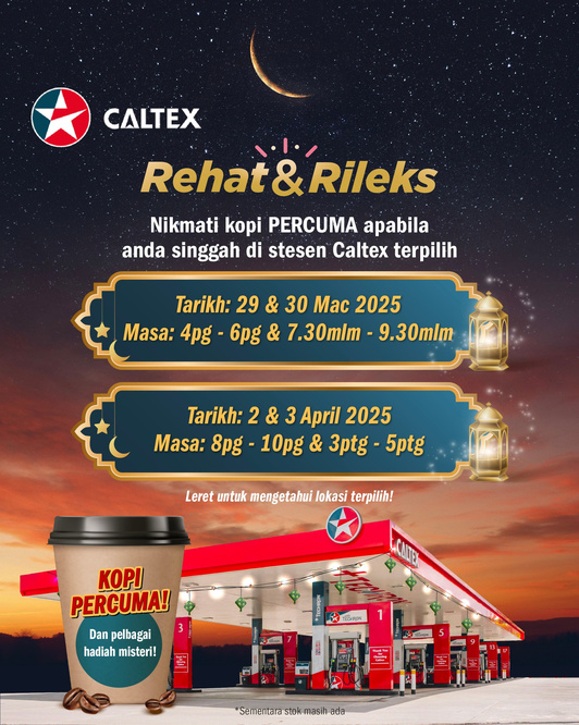 Caltex 将在 2025 年 3 月 29-30 日和 4 月 2-3 日的指定时间,在各大高速公路休息站 Caltex 加油站为民众提供免费咖啡。同时,Caltex 也会在各大油站提供各种免费食物,包括炒米粉、Bubur Lambuk、Bubur Nasi、Bubur Kacang、Kurma 和饮料。