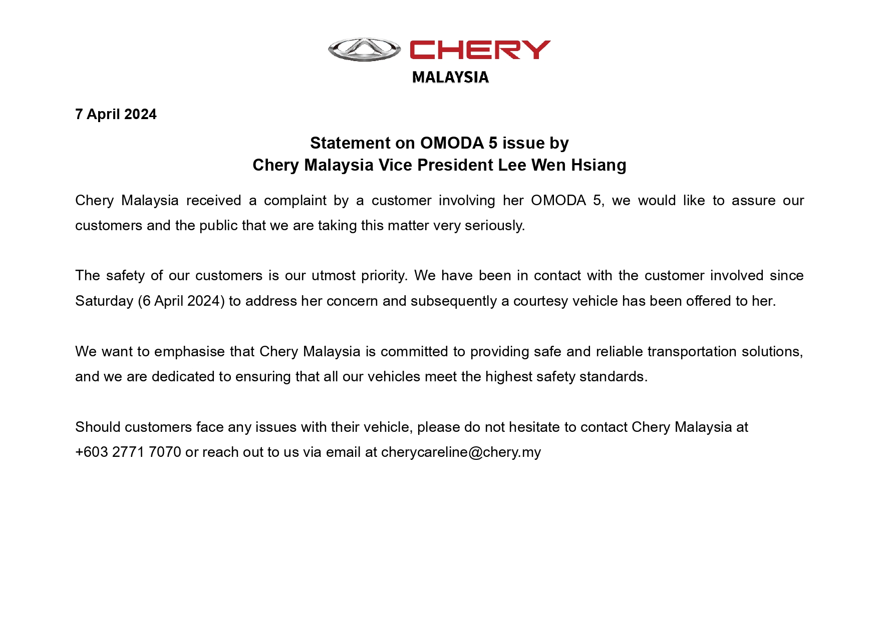 Chery Malaysia Vice President Lee Wen Hsiang stated: "The safety of our customers is our utmost priority. We have been in contact with the customer involved since Saturday (6 April 2024) to address her concern and subsequently a courtesy vehicle has been offered to her."