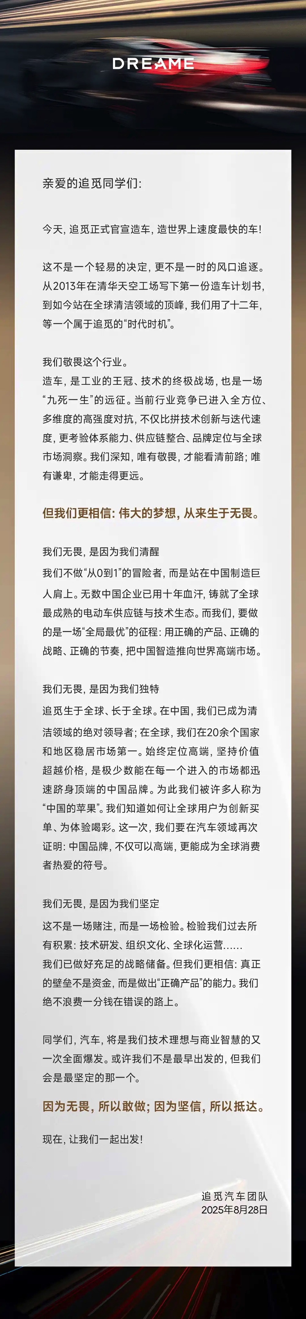 品牌日前在中国社媒发布了一篇帖文,阐明其进军汽车领域的计划,表示将追随小米和华为等科技集团等步伐。不过,Dreame 的目标是打造世界上最快的汽车,追逐速度记录。