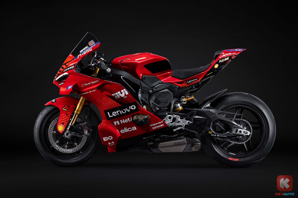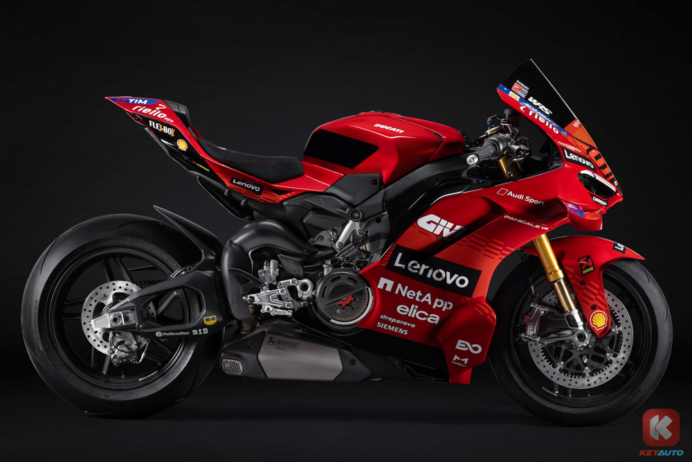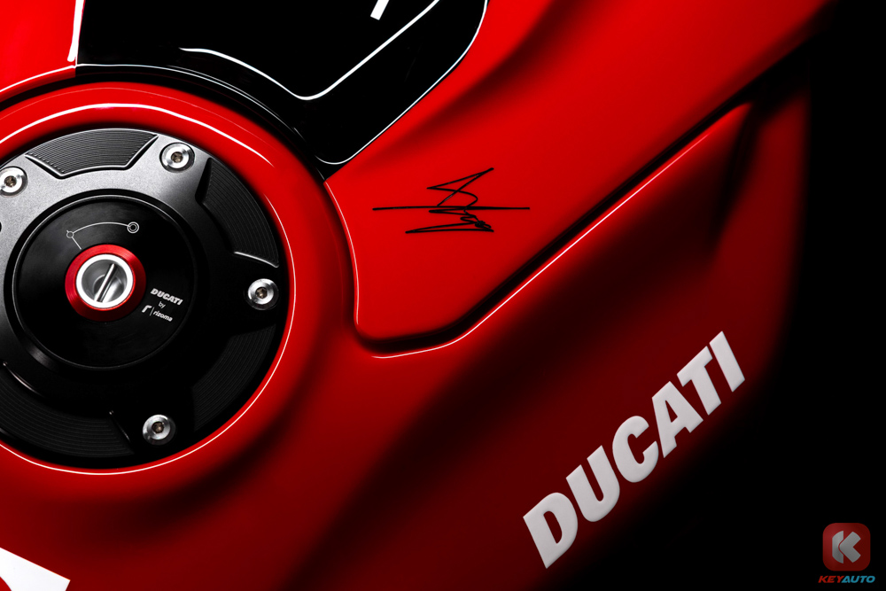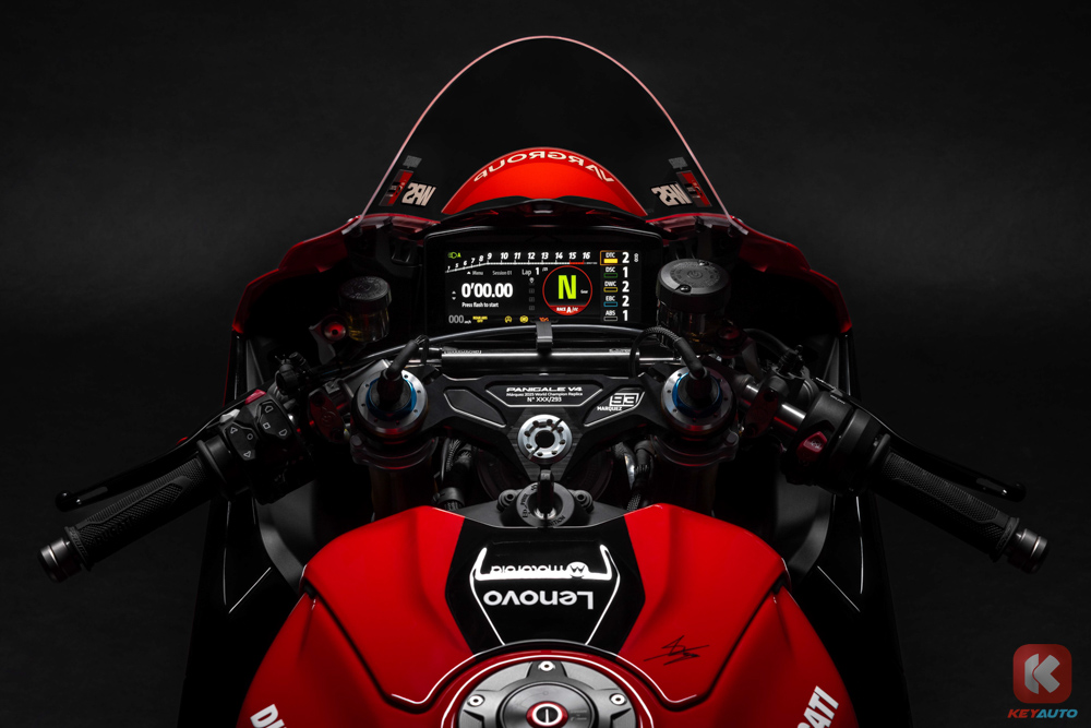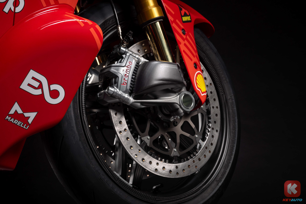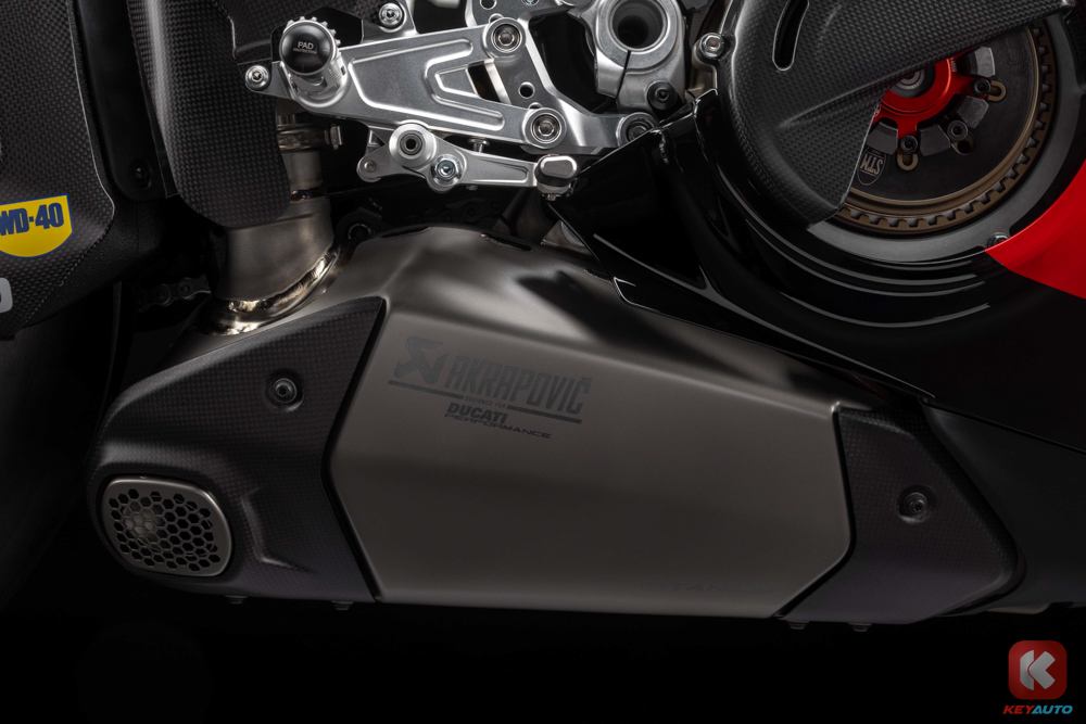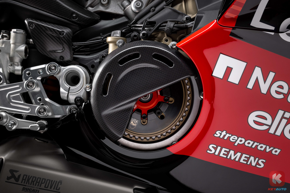 不止如此,在这台顶级限量版车型上,Ducati 还为其配上了 MotoGP 级别的 STM-EVO SBK 干式离合,338.5mm 超大 Brembo T-Drive 刹车碟搭配 Brembo GP4 Sport 组成的 Brembo Pro+ 刹车系统,Akrapovič homologated 轻量化排气、来自 Öhlins 的顶级避震系统 DES 3.0、全碳纤维轮圈、专属 Alcantara 坐垫以及大量碳纤维车体套件。