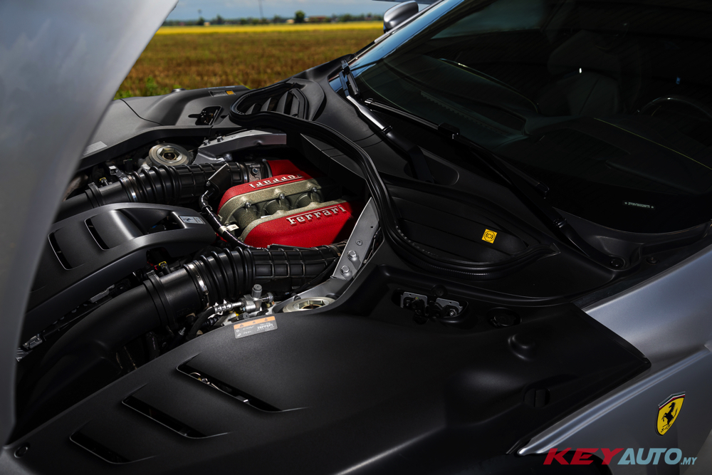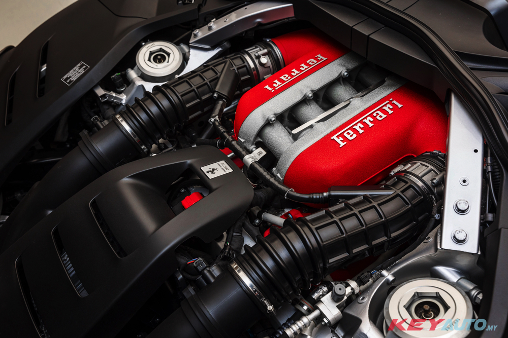 The engine’s direct injection system comprises two high-pressure fuel pumps (350 bar) that deliver petrol to the injectors in the combustion chambers. The ignition system, comprising 12 coils and spark plugs, is constantly monitored by the ECU which has an ion-sensing system that measures ionising currents to control ignition timing. It has a single- and a multi-spark function to make the combustion as efficient as possible at all revs. The ECU also controls combustion in the chamber to ensure that the engine is always working at peak thermodynamic efficiency, thanks to a sophisticated strategy that recognises the octane rating (RON) of the fuel in the tank and adjusting the advance to suit. The engine strategy includes a new patented function derived from Ferrari’s Formula expertise that optimises the torque during transient acceleration manoeuvres in the low and mid-range.