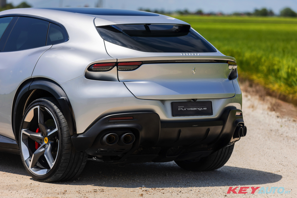 The aerobridge theme characterises the flanks as the form runs along the side, becoming the main styling theme and creating a dihedral shape which ends in the imposing rear muscle. The wheelarch trim treatment reveals the Purosangue’s second skin beneath the bodywork. The functional and technical elements become a second visual layer and this creates the impression almost of a floating coupé.