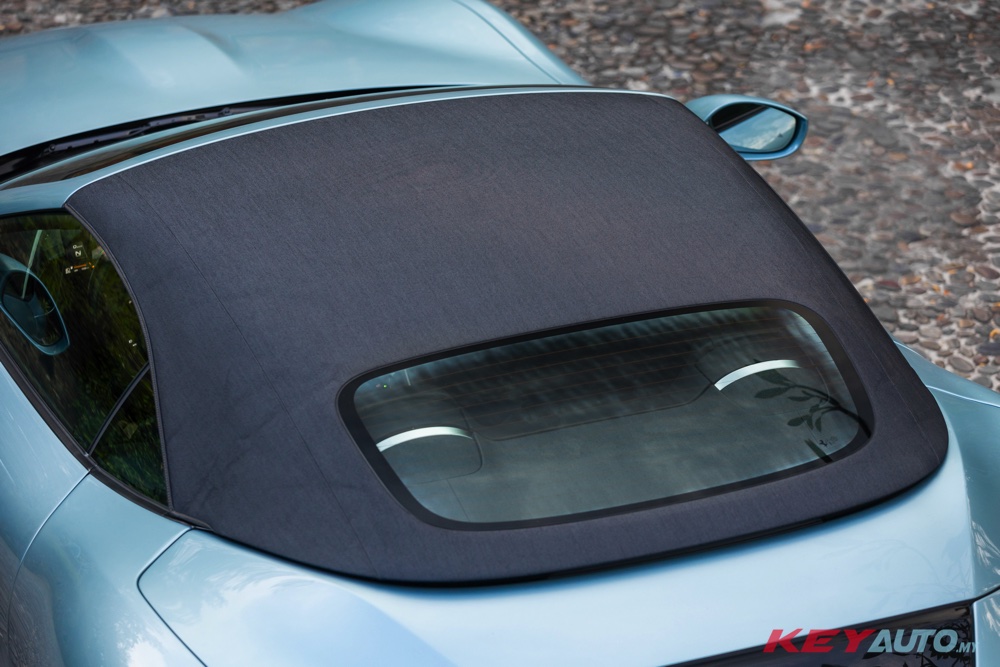 across the base of the roof that divides the carbon-fibre active spoiler from the roof and rear screen, creating a seamlessly integrated tonneau cover. When the soft top is lowered, the active spoiler visually connects with the rear bench and head rests.