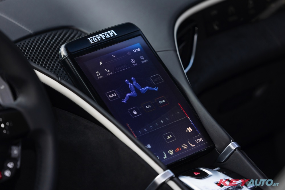 The technology adopted is derived from the Ferrari Roma: the digital instrument cluster is integrated with the volumes around it and protected by an anti-glare binnacle which extends out naturally from the dash. The passenger has an optional display that allows them to