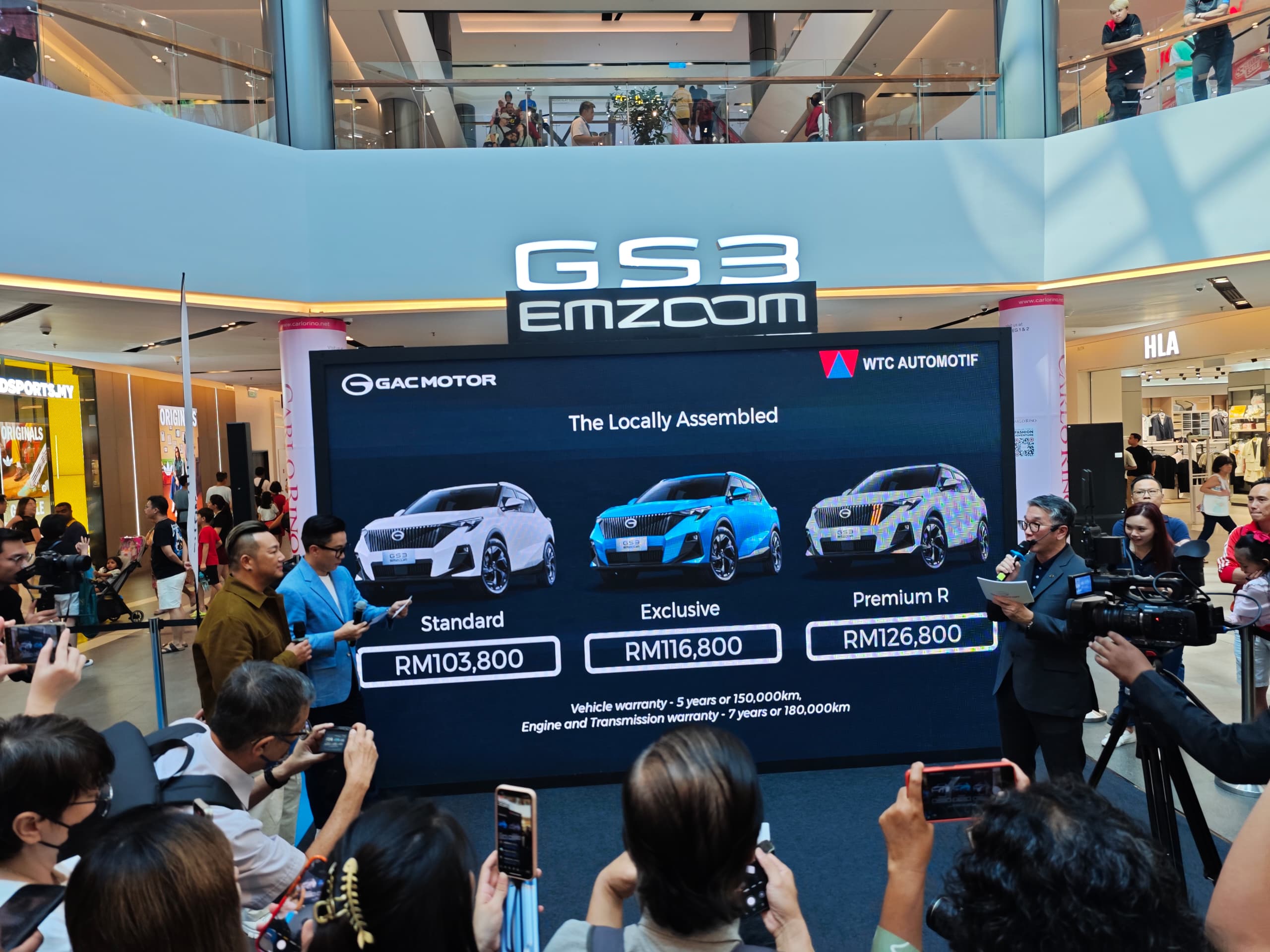 华丽山陈唱汽车(WTCA)代理的中国广汽 (GAC)在今年 8 月份推出本地组装(CKD)的 GAC GS3 EMZOOM Premium-R(RM126,800),今日 WTCA 宣布推出本地组装 GS3 EMZOOM 的另外两个等级车型,分别是入门的 Standard(RM103,800)和中阶的 Exclusive(RM116,800)。