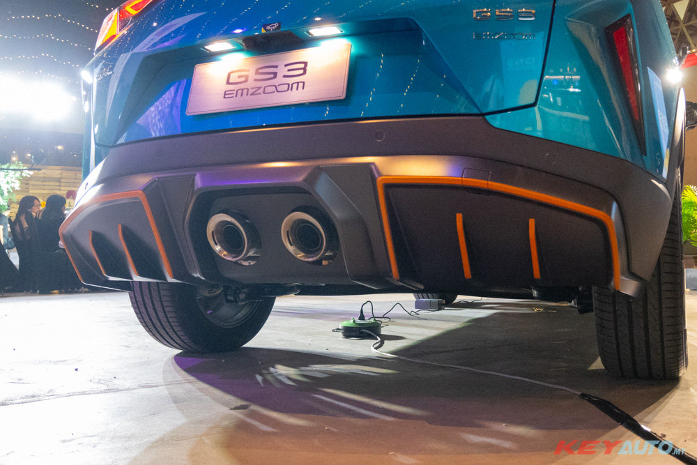The GS3 Emzoom boasts extremely aggressive body aesthetics with sharp lines all around the car, showcasing strong characteristics. It features Laser Eye LED Headlights, 18-inch alloy wheels, flushed door handles, and a very sporty dual-exhaust pipe at the rear bumper.