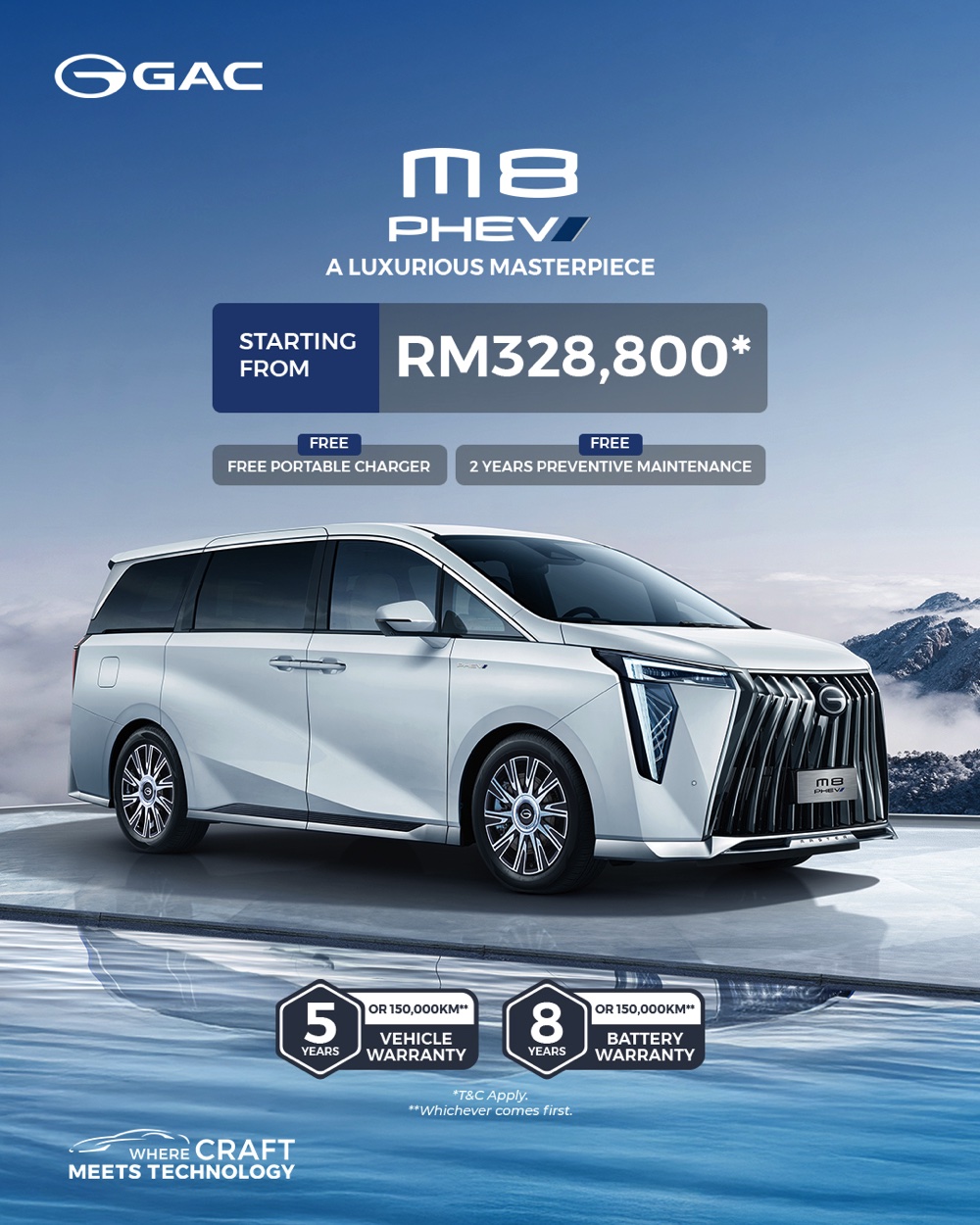 广汽传祺(GAC)在大马的独家经销商 WTC Automotif(M) Sdn Bhd (WTCA),正式在本地发布了 GAC M8 PHEV,分为两种车型,Premium 开价 RM328,800,而 Luxury 开价 RM388,800(上路价,不含保险)。