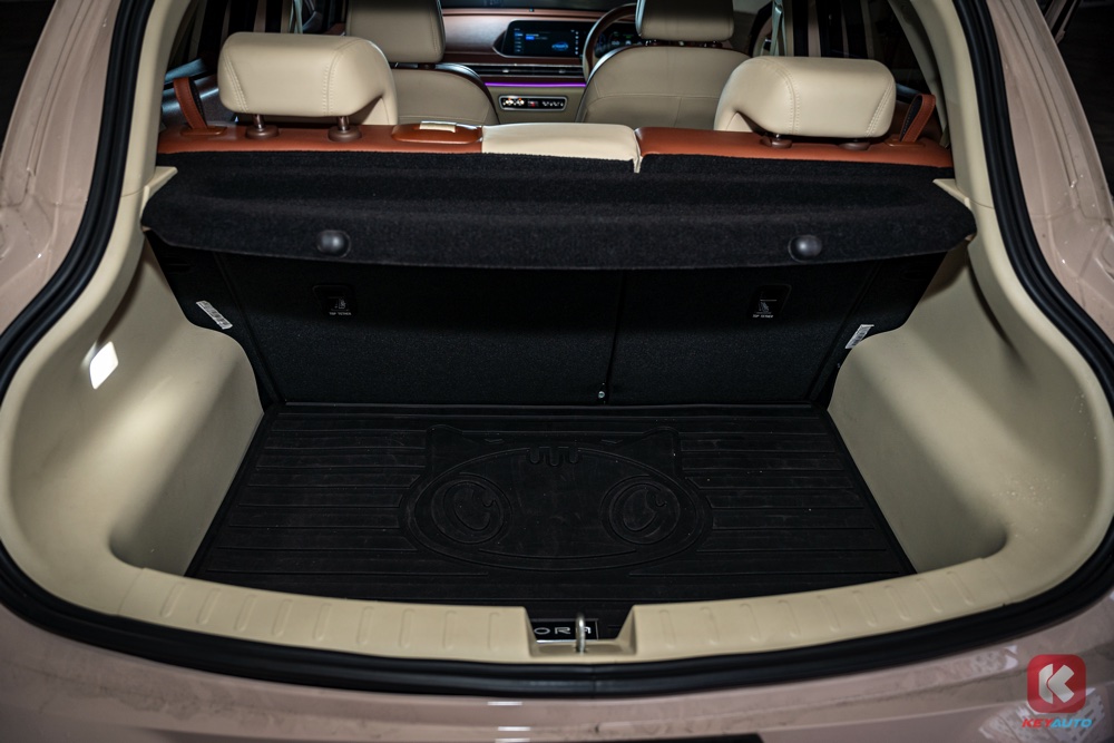 Ora Good Cat 的车身尺寸为 4,235mm X 1,825mm X 1,596mm,轴距为2,650mm。紧凑的车型与优秀的操控性,让驾驶者能轻松穿梭于繁忙都市。不过,紧凑并不代表空间不足,后座的腿部空间依旧宽敞舒适,而 228L 的后车厢容量也足以应对日常所需。放倒后排座椅更可获得 858L 的大容量,购物或搬家都能轻松应对。