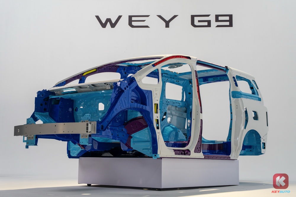 GWM WEY G9 在中国称为 “高山 7”,是安全性极高的一款车,从车体刚性、底盘结构、安全气囊到电池保护,多方面保护乘客安全。车子的 A 柱和 B 柱焊入了 2000Mps 和 1500Mpa 超高强度钢,这款 1500Mpa 的使整体车头在碰撞时能维持不变形。车尾加入了 0.6mm 的全金属防撞杆,在车尾受到碰撞时提供支撑与碰撞保护。底盘则采用四纵七横设计,在底盘中形成 3 条有效分散冲击力的路径,强化车身刚性并达到轻量化作用。