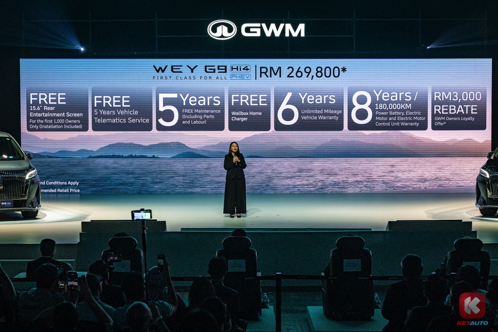 原厂为新车提供 6 年无限里程整车保固、8 年/180,000km高压电池保固、5 年车载网络、5 年免费保养(涵盖人工与零配件),并赠送壁挂式充电桩。现有的 GWM 车主则可享有额外 RM3,000 折扣。首 1,000 位车主可获赠安装于第二排的15.6 寸吸顶式娱乐屏幕。
