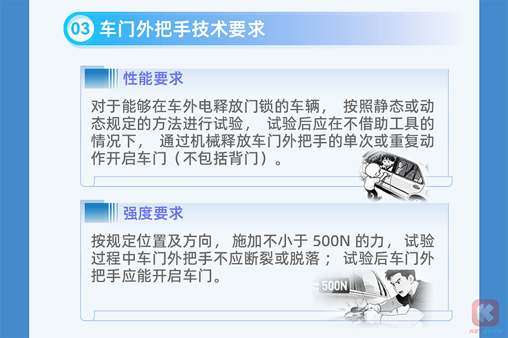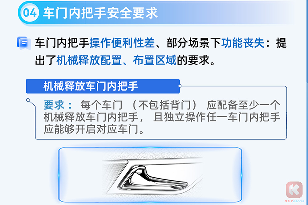 根据中国工信部出台的规定,外门把手除了必须使用传统机械结构之外,在拉动时所需的力道不得高于 500N、且在拉动时不易损坏。简单来说就是外门把造型必须一目了然,操作便利!