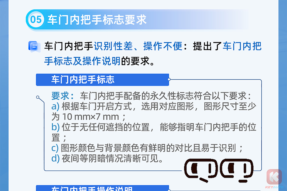 而内门把则有更为严格的规则,或许介于市场上存在许多造型各异的门把手,中国工信部明文列举出了相关规范造型。其中最重要的除了内门把手的位置必须直观清晰、操作简单之外,在门把位置还需镶嵌上车门开启的方式(如推开或滑动打开等)。