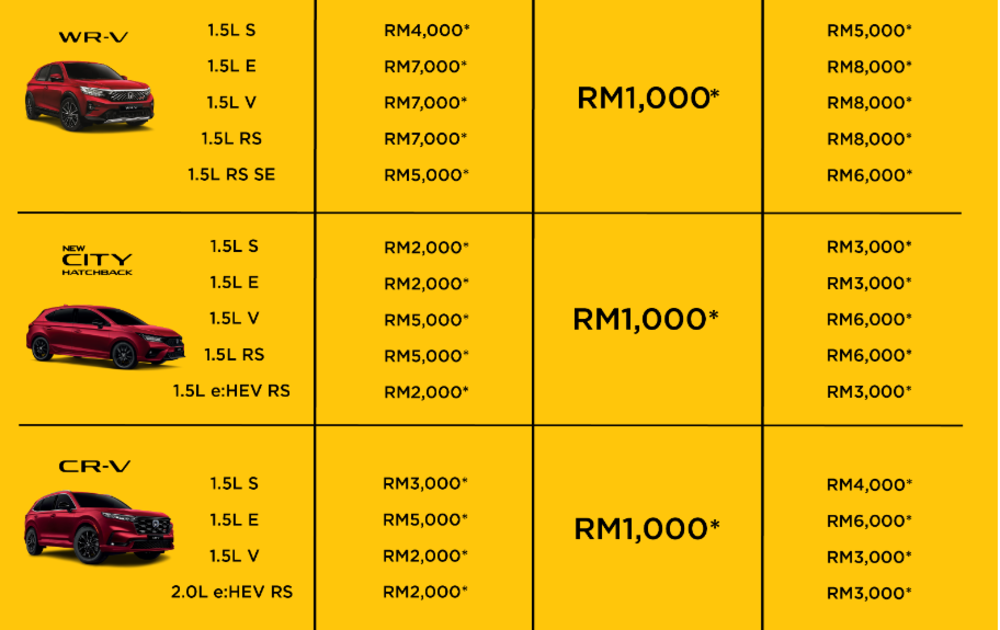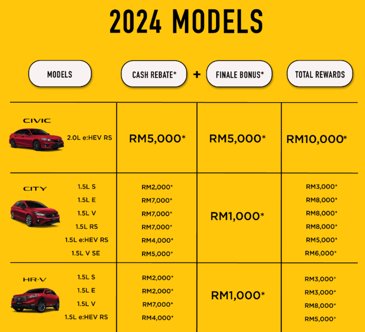 Honda Malaysia 推出 2024 年最后一波年终促销,与 10 月和 11 月的优惠相同分为现金优惠和最终奖励(Final Bonus),最高优惠达 RM10,000。仅限即日起至 2024 年 12 月 31 日注册的车辆,存货有限,售完为止。