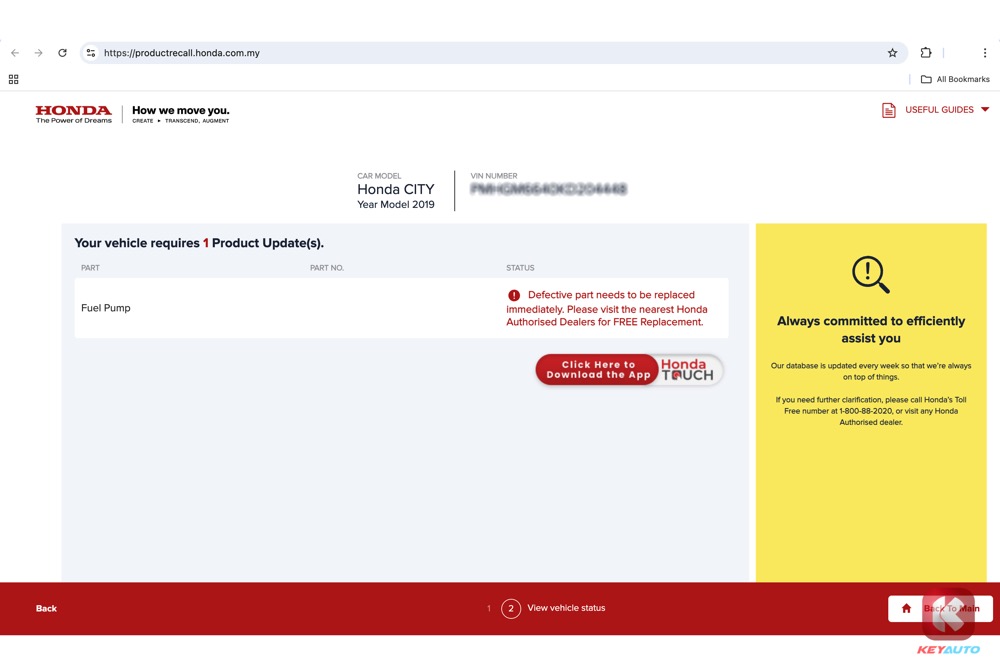 车主可以通过 HondaTouch 应用程序获取产品召回信息或检查车辆状态,或拨打马来西亚本田免费电话 1-800-88-2020 或登录 www.honda.com.my/productrecall.honda.com.my 查看车辆状态。