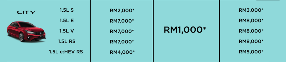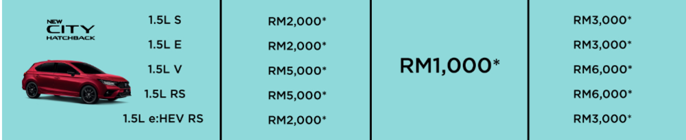 City Hatchback 从原有的全车系现金优惠 RM2,000 ,提升至 RM2,000 至 RM5,000 。唯有 1.5L V 和 1.5L RS 两个等级获得 RM5,000 现金优惠。总折扣介于 RM3,000 至 RM6,000。