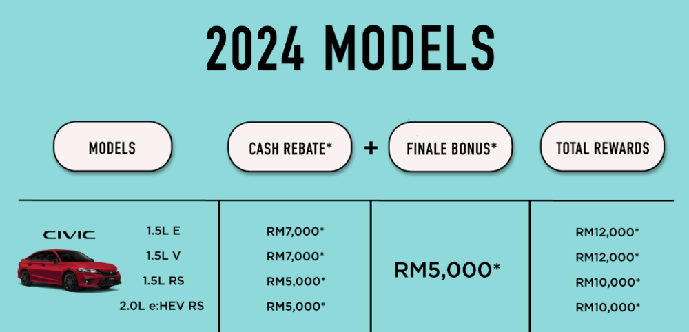 Honda Civic 和 WR-V 的优惠维持不变。Civic的现金优惠介于RM5,000 至 RM7,000,加上 RM5,000 的最终奖励,总优惠高达 RM10,000 至 RM12,000。