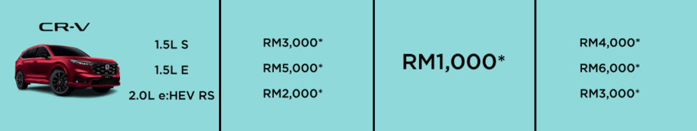 Honda CR-V 原本只为入门的两个等级提供 RM3,000 现金折扣,此次 2.0L e:HEV RS 也加入行列,现金折扣为 RM2,000,而1.5L E 的现金折扣也提升至 RM5,000。 加上最终优惠 RM1,000,总折扣介于 RM3,000 至 RM6,000。敬请锁定 KeyAuto.my